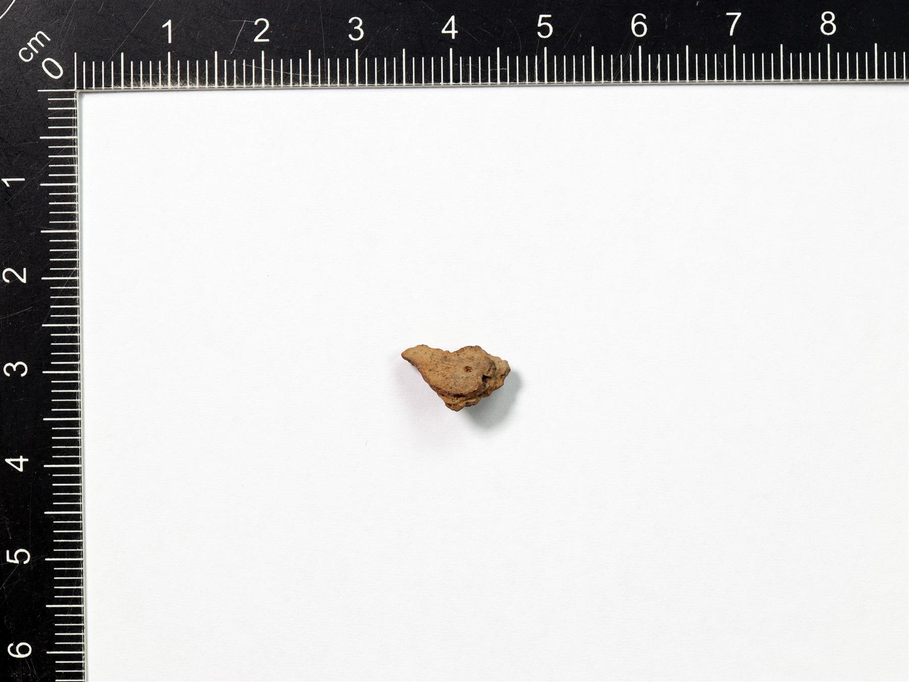 | Pieni lohjennut pala. Saviaines vaaleanruskea, huokoinen ja orgaanissekoitteinen. | |