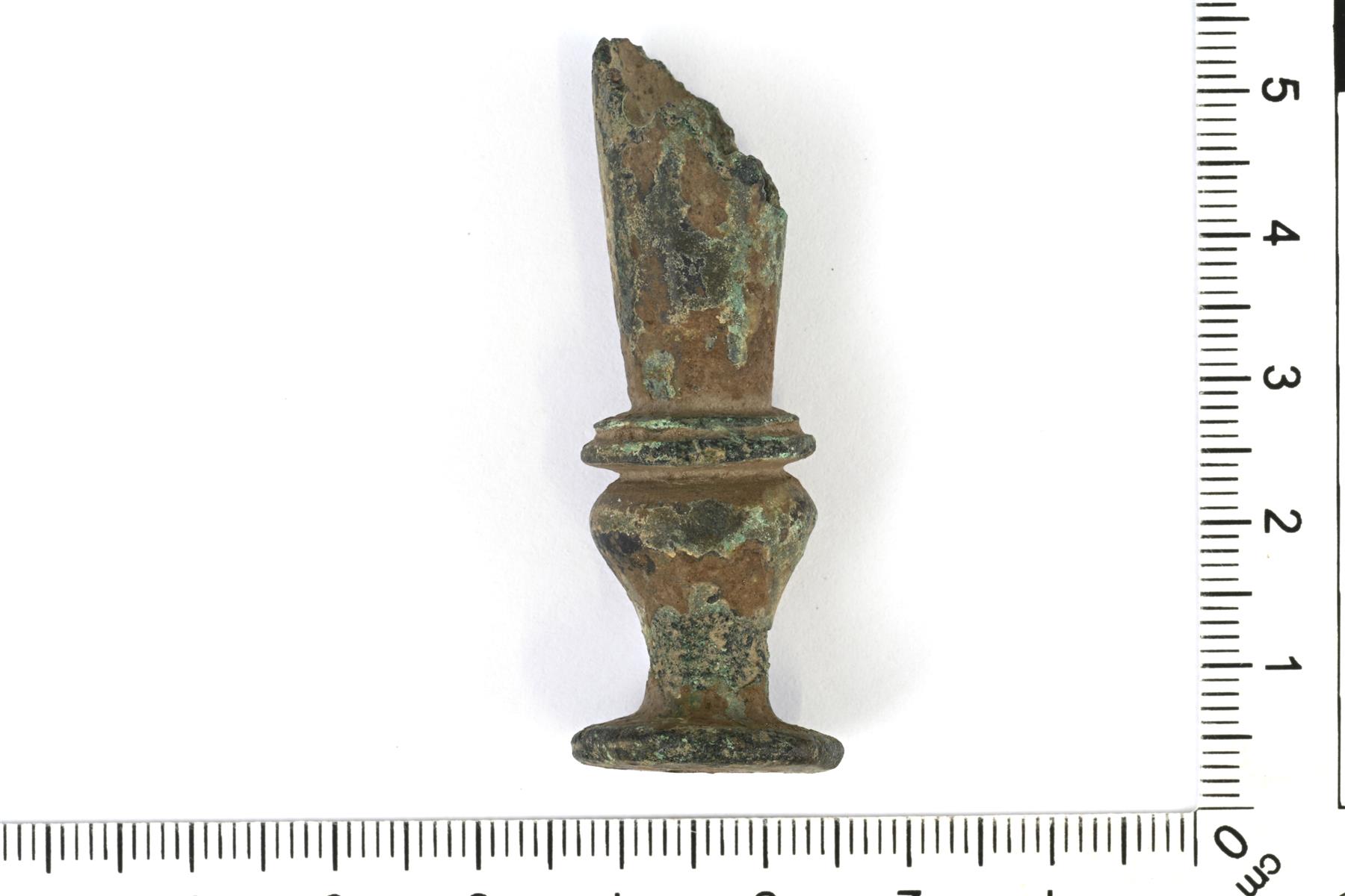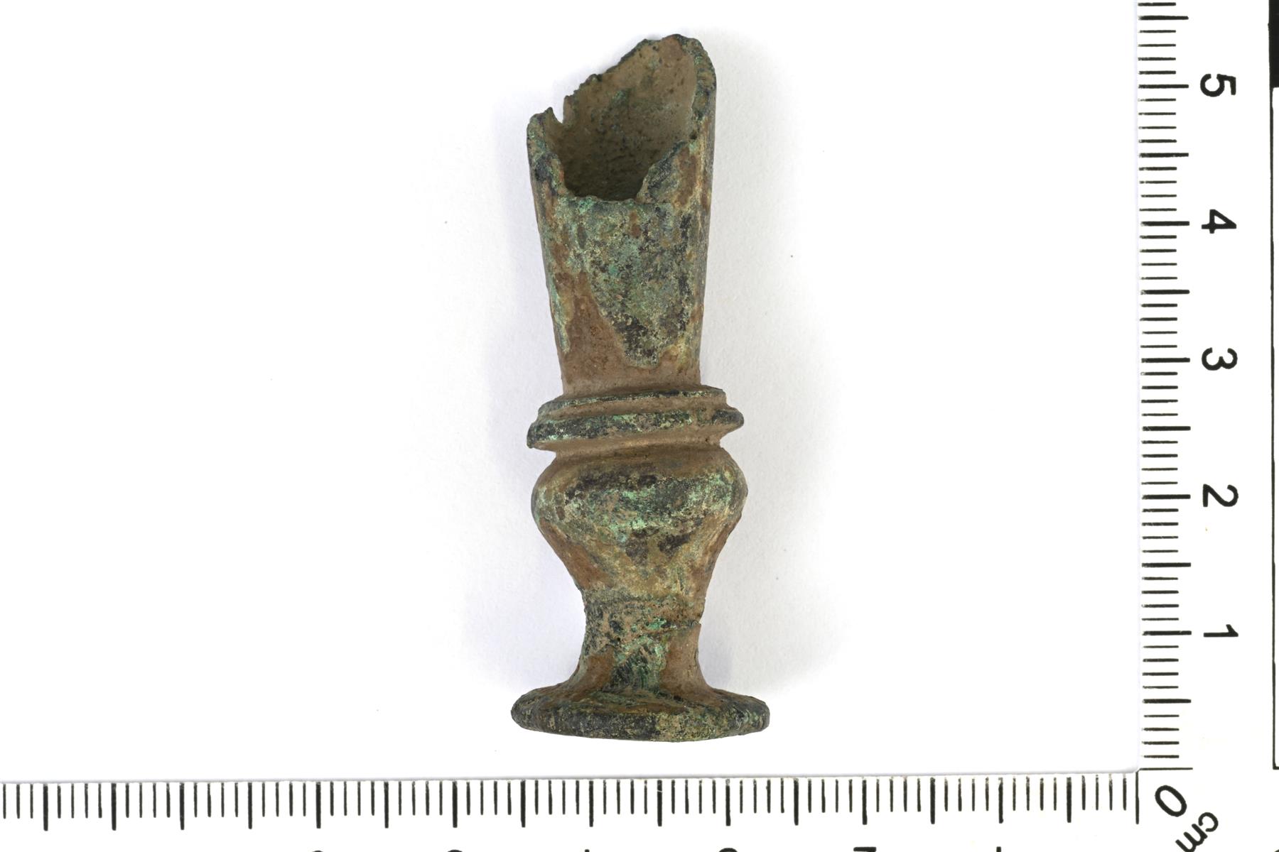 | Juomasarven pohjahela. Yläosa on ylöspäin levenevä kartio, jonka reunat ovat murentuneet. Alaosa on muodoltaan vaasiprofiloitu ja kärki levenee pyöreäksi levyksi. Vrt. Salo Taf. 28: 5. | |