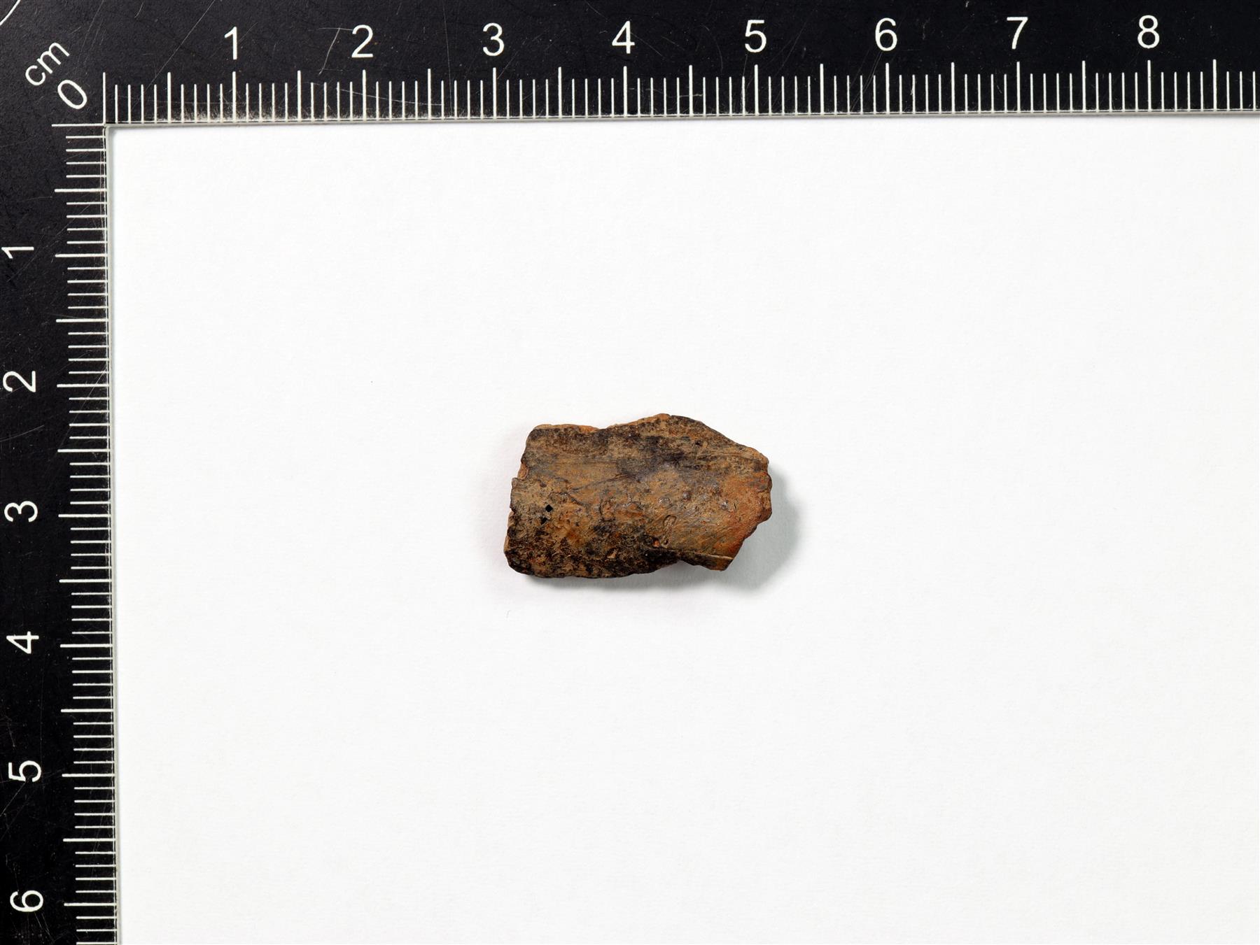 | Lohjennut reunapala, jonka ulkopinta on kiillotettu. Saviaines vaaleanruskea, tiivis ja kivimurskasekoitteinen. | |