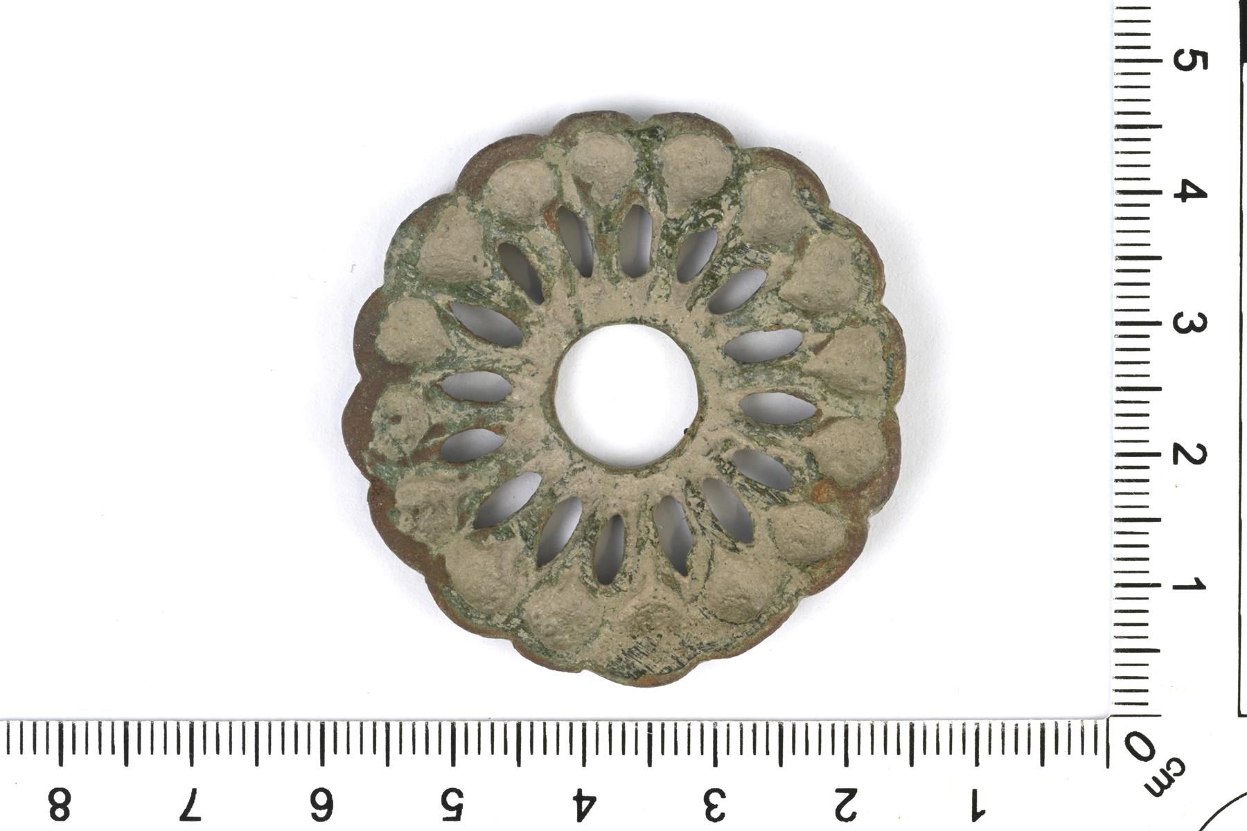 | Valamalla tehty amuletti. Keskellä on pyöreä reikä. Keskiosasta lähtee kuusitoista pisaranmuotoista ulkonemaa, jotka yhdistyvät toisiinsa ulkoreunassa. Muodoltaan ratasmainen ja muistuttaa läheisesti balttilaisia solkia, mutta esineen taustapuolella ei ole neulakotaa tai neulan kiinnityslenkkiä. Kyseessä on vaatteeseen tai vyöhön kiinnitetty koru tai amuletti (ns. Zierscheibe). Vastaavanlaisia on löytynyt Perniöstä (KM 9981: 1; ks. Kivikoski Abb. 103) ja Raaseporista (KM44678: 1). Ks. myös Michelbertas Pav 2: 1; Khomiakova Fig. 6: 2, 8. | |