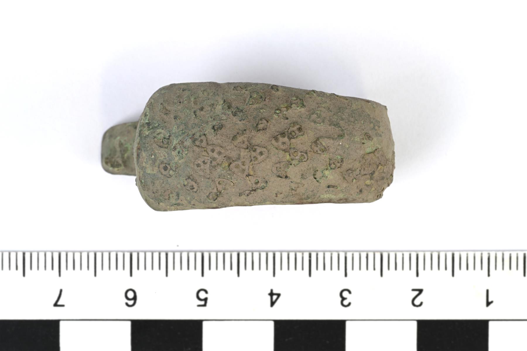 | Massiivisen rannerenkaan puolikas. Pinta on pahoin kulunut. Koristelusta erottuu D:n muotoisia leimoja. | |
