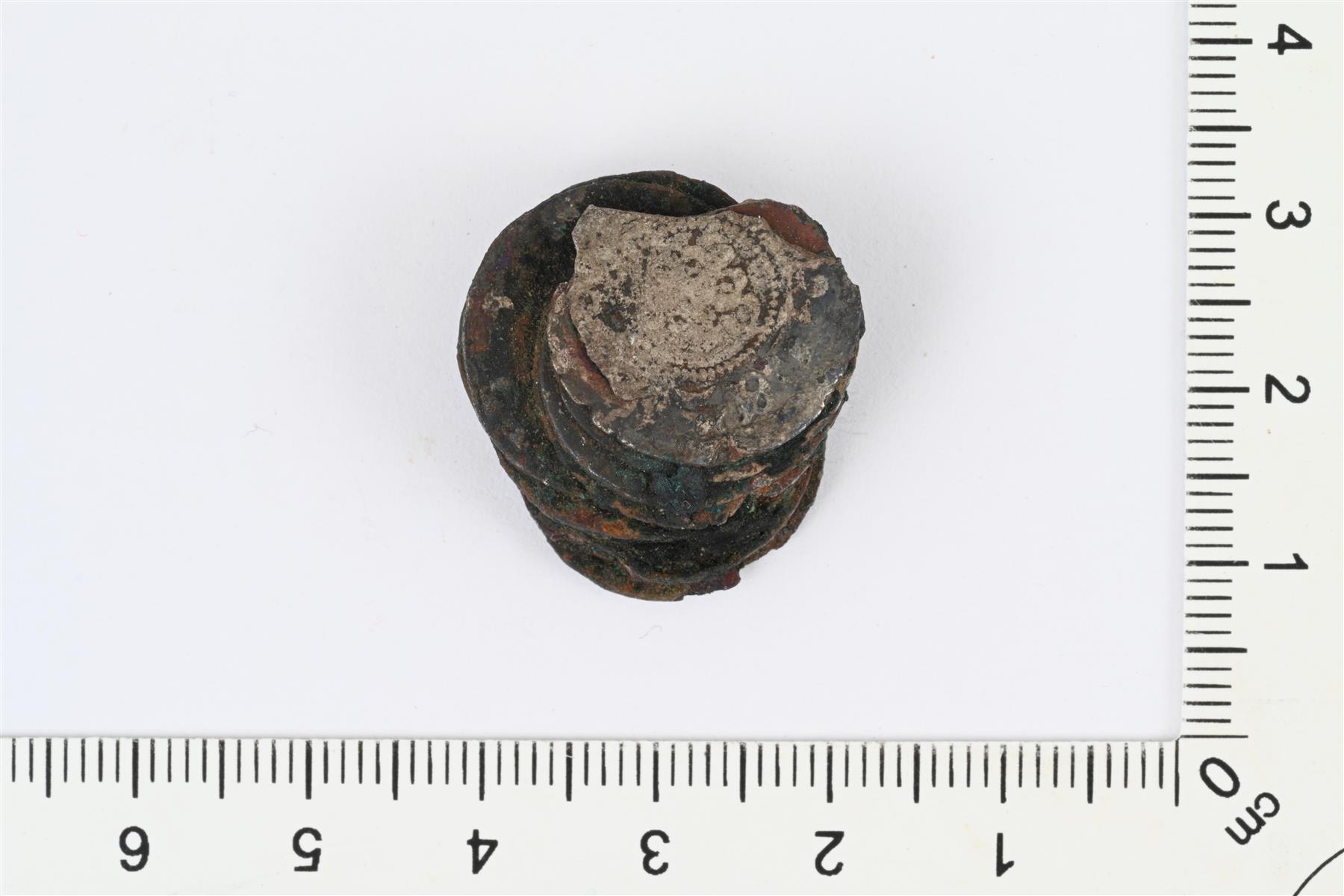 | Pino yhteen tarttuneita keskiaikaisia rahoja, noin 10 kpl. Päädyissä luultavasti ruotsalainen 1/2 aurto ja Tartossa lyöty raha. | |