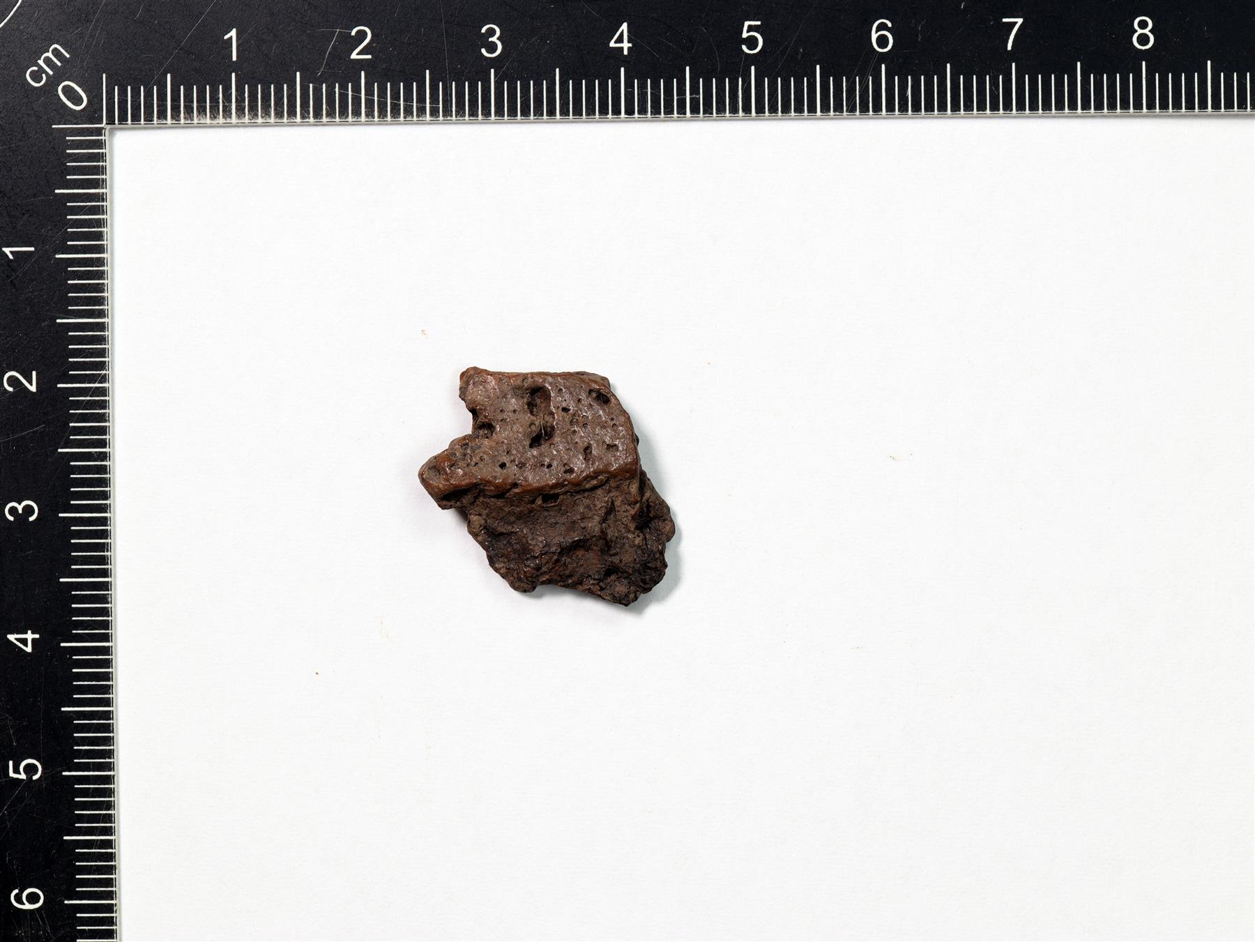 | Lohjennut pala, jonka ulkopinta on kiillotettu. Saviaines harmaannruskea, huokoinen ja orgaanissekoitteinen. | |