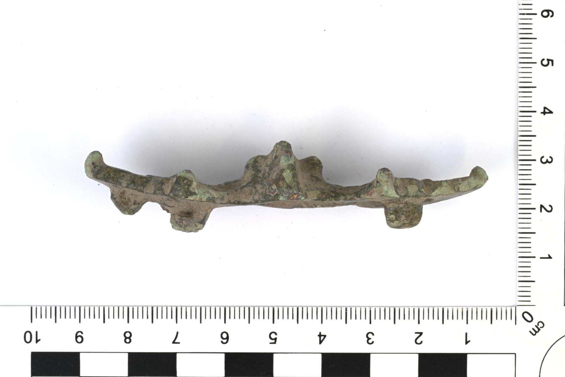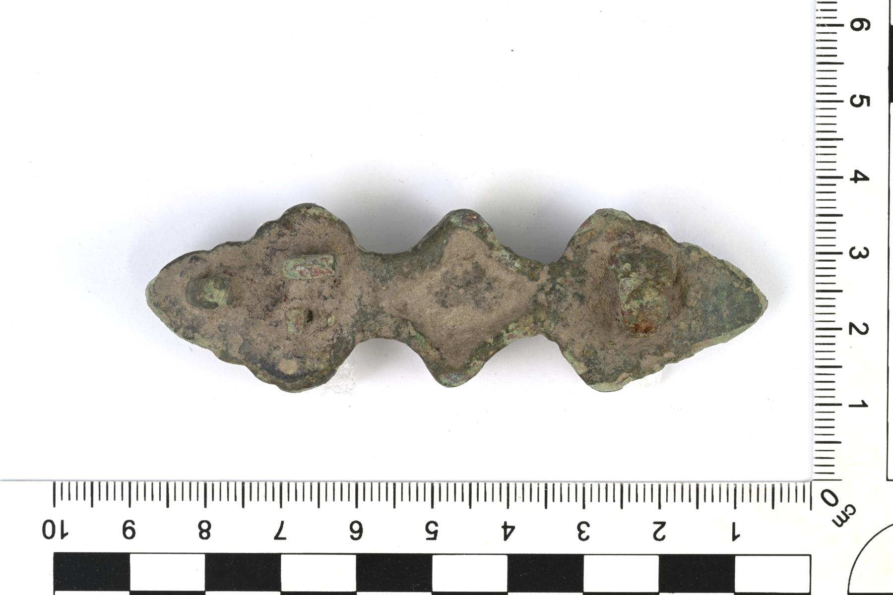 | Lähes kokonaisena säilynyt tasavartinen solki. Koristeluna viivakuviointia ja tappeja. Taustapuolella on neulakota, kaksi neulan kiinnityslenkkiä (toinen on hajonnut) sekä ketjun ripustuslenkki. Vrt. Kivikoski Fig. 16. | |