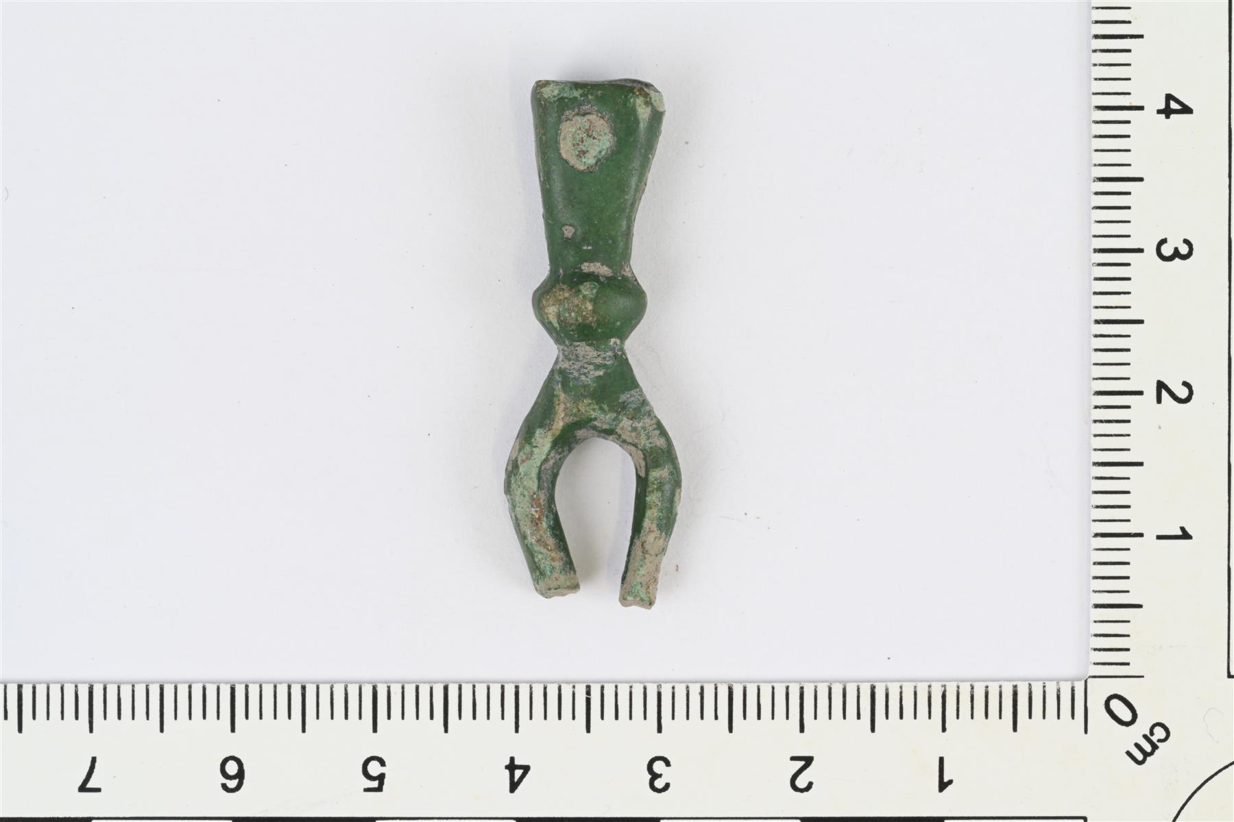 | Pitkänomaisen hihnanpäätehelan katkelma. Hihnaan kiinnittyvän osan päässä nuppi ja sen jatkona murtunut lenkkimäinen osa. | |