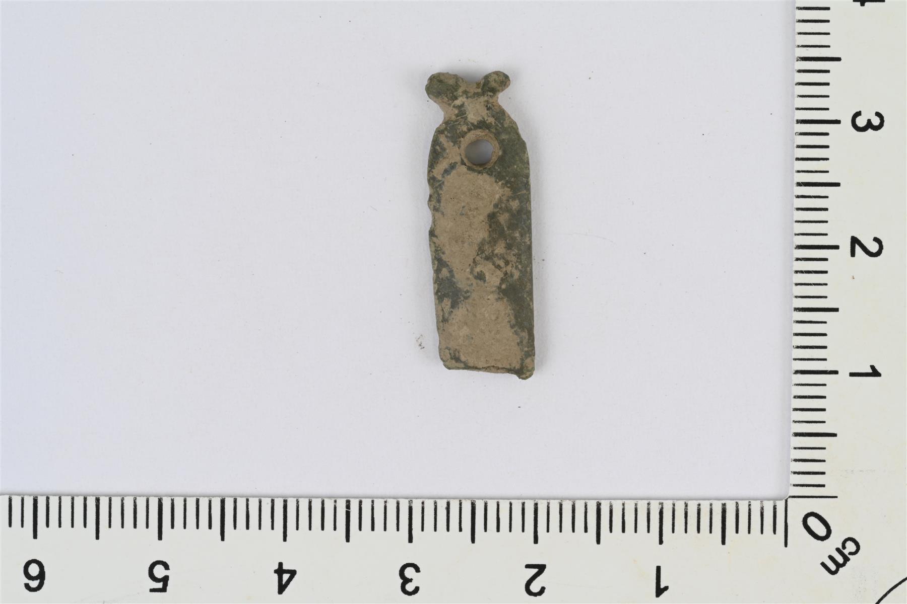 | Litteän neulan katkelma. Ehjässä päässä pyöreä reikä ja kalanpyrstömäinen uloke. | |