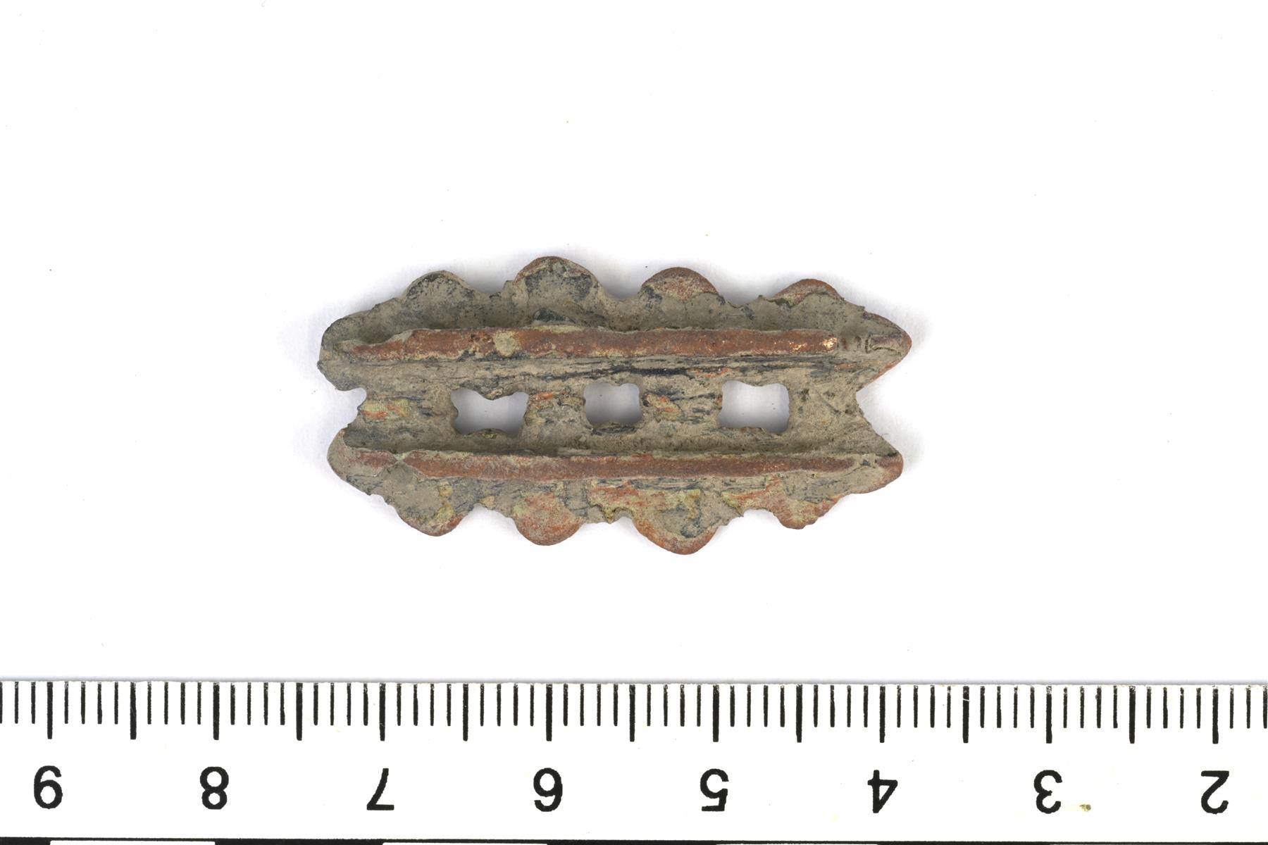 | Melko kulunut ketjunjakaja. Levymäinen etuosa koostuu neliönmuotoisista koristekuvioista, joiden keskellä on häränsilmäleima. Taustapuolella on kaksi poikittaista listaa, joista ensimmäisessä on seitsemän ja toisessa kahdeksan reikää ketjuja varten. Yhdessä reiässä on metallilangan jäänne. Vrt. Kivikoski Abb. 774. | |