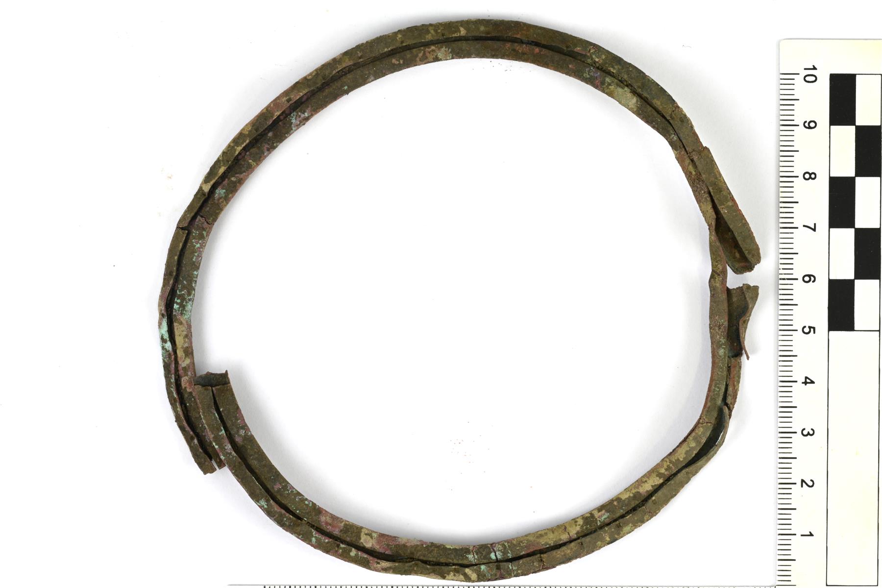 | Ohuesta kupariseospellistä tehty kehä. Avonainen sauma erottuu toisella puolella. Ulkokehässä on pieniä kiinnitysreikiä. | |