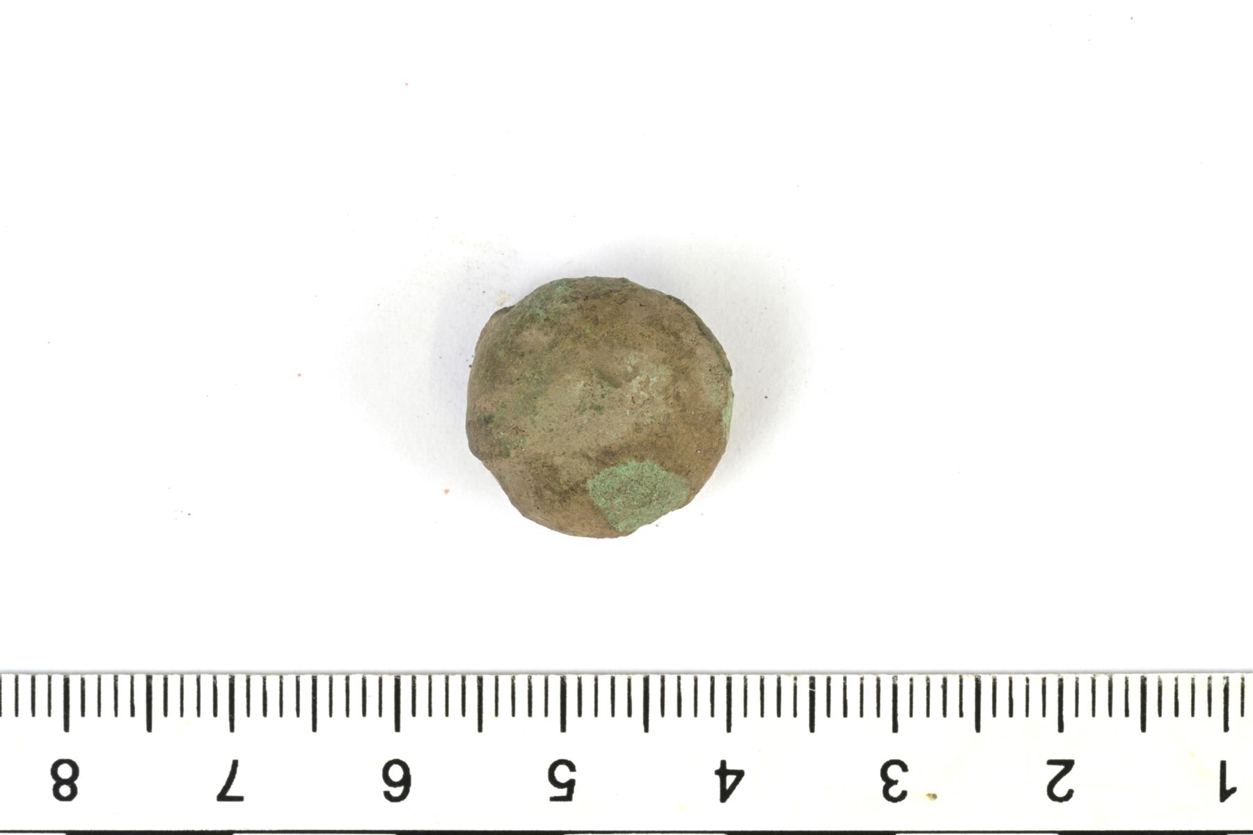 | Pahoin kulunut kuulamainen punnus. Alkuperäinen pinta on suurelta osin kuoriutunut pois. Ei magneettinen. | |
