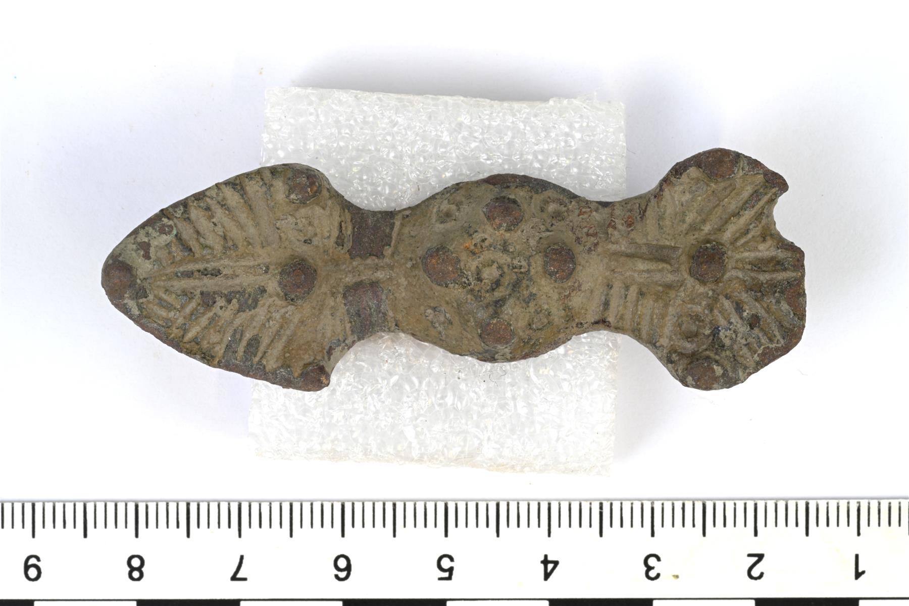 | Toisesta päädystä hajonnut tasavarsisolki. Koristeluna viivauurteita, tappeja ja häränsilmäleimoja. Taustapuolella neulakota ja kaksi rinnakkaista neulan kiinnityslenkkiä. Vrt. Kivikoski Fig. 19. | |