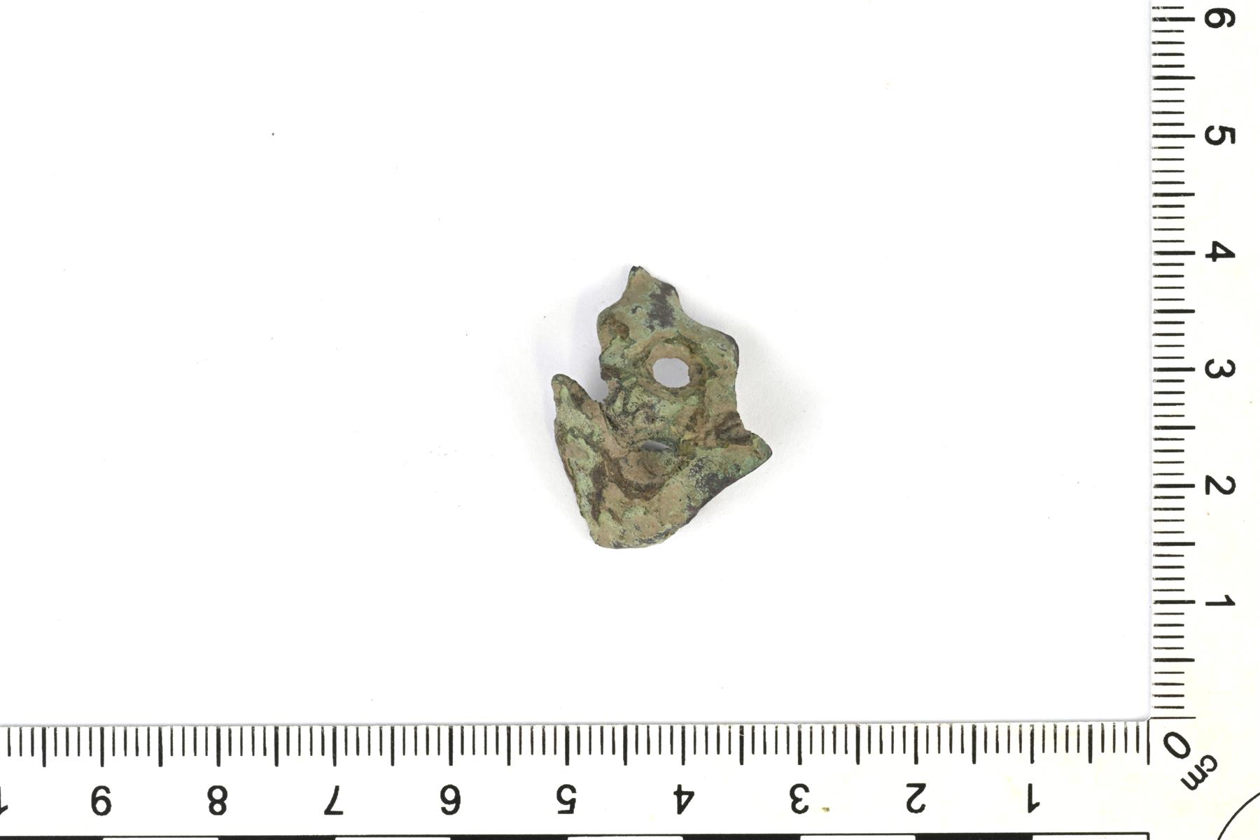 | Pahoin kuluneen pyöreän kupurasoljen reunakatkelma. Taustapuolella on neulan kiinnityslenkki. Todennäköisimmin A- tai B-tyypin soljesta. | |