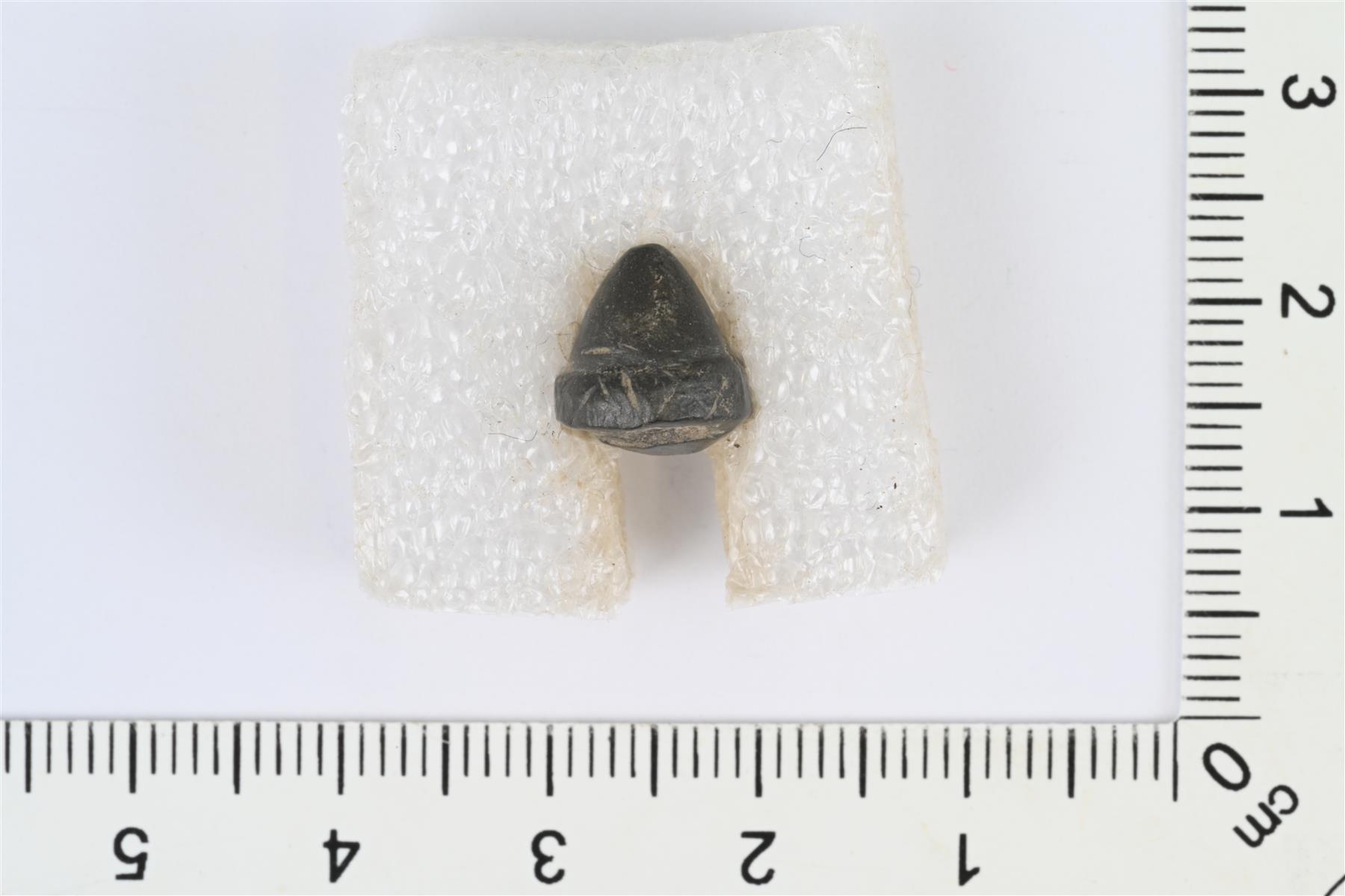 | Kartionmuotoinen, nuppimainen esine. Paksummassa päässä reunus, jossa uurrettuja vinoristejä. | |