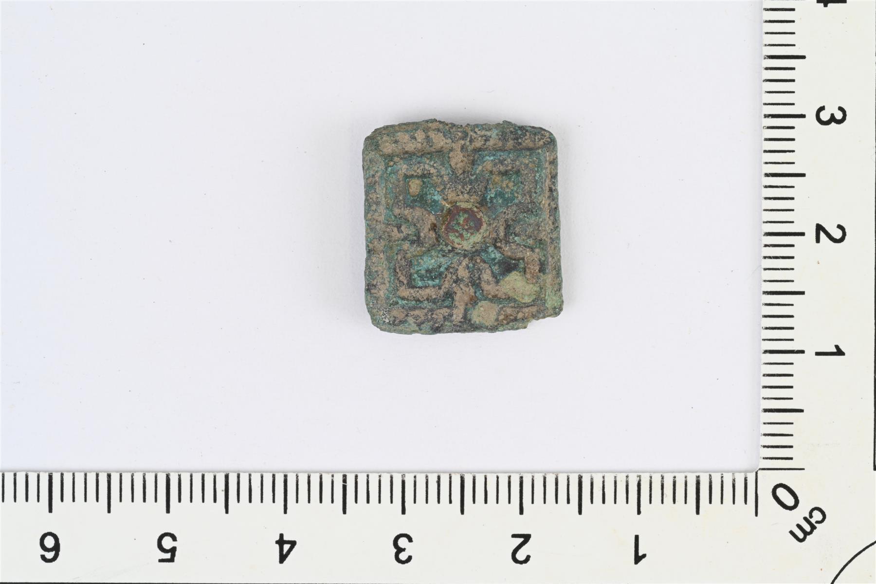 | Neliönmuotoinen vyönhela, ruusukehela. Etupuolella reliefikoristelua, jossa vinoristi. Taustapuoli kovera. Keskellä niitti, joka näkyy helan etupuolella. | |