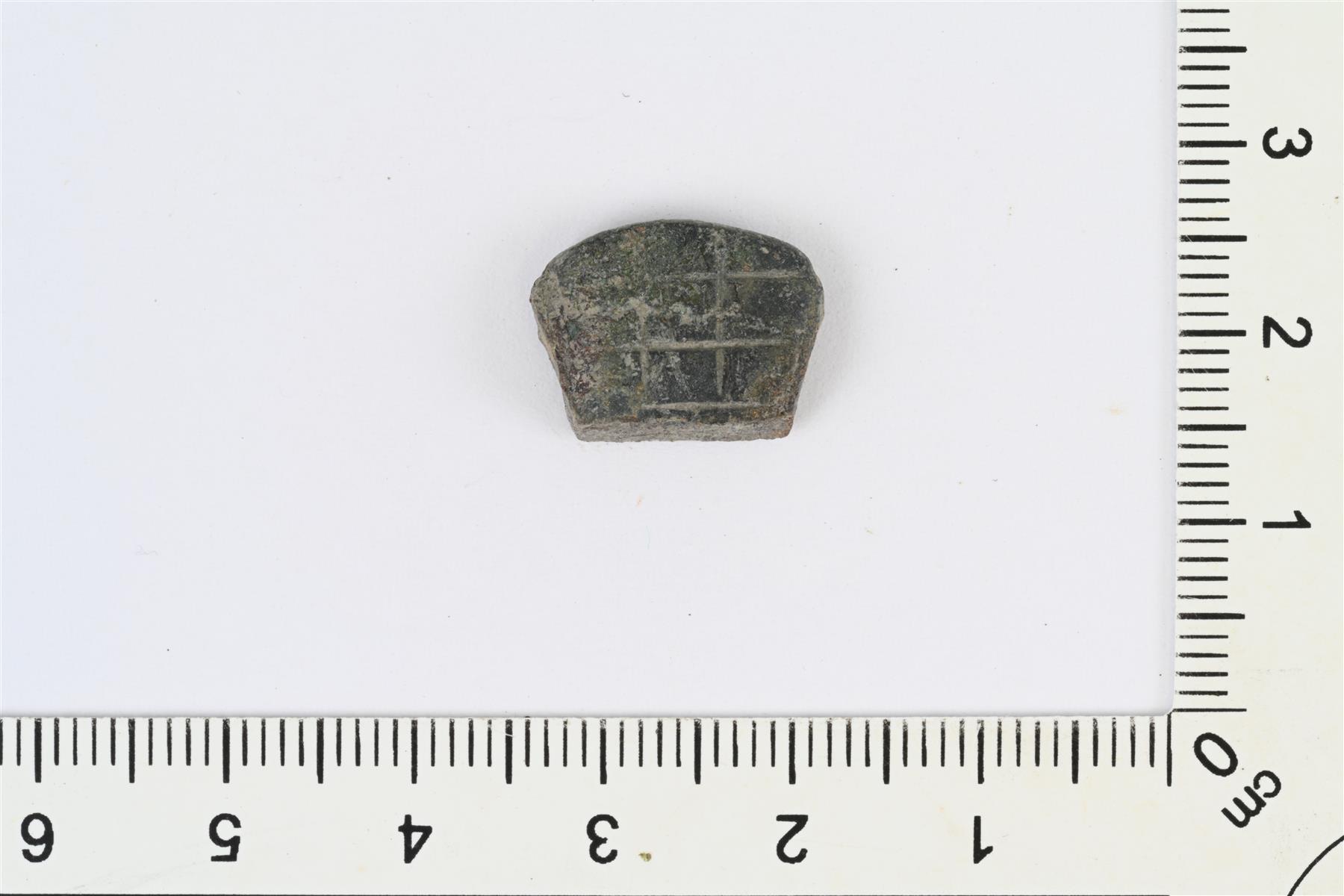 | Pöytäveitsen päätehela. Kupera pääty. Molemmille pinnoille uurrettu ruudukkokuvio. | |