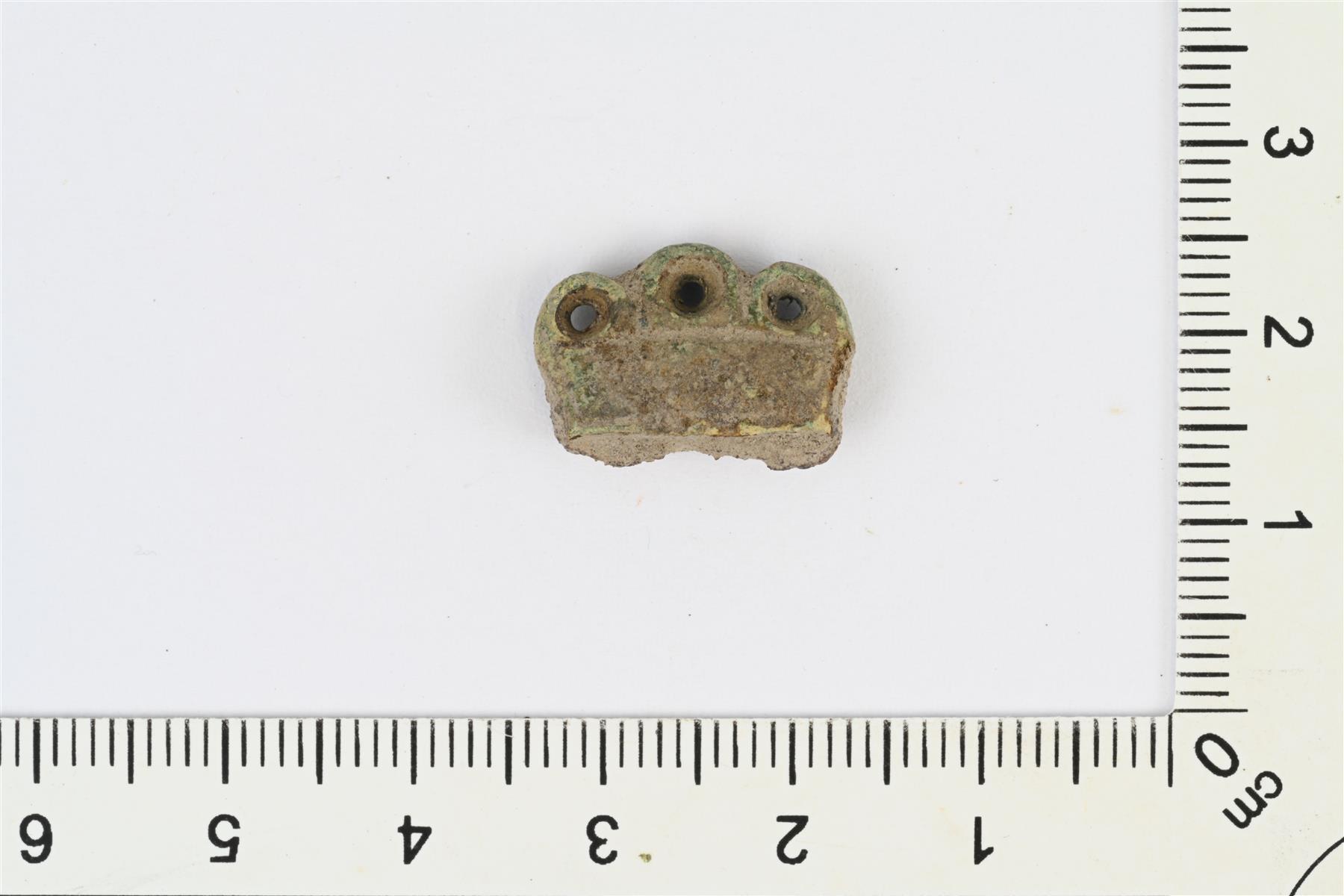 | Pöytäveitsen päätehela. Päädyssä kolme pyöreää uloketta, joissa reiät. | |