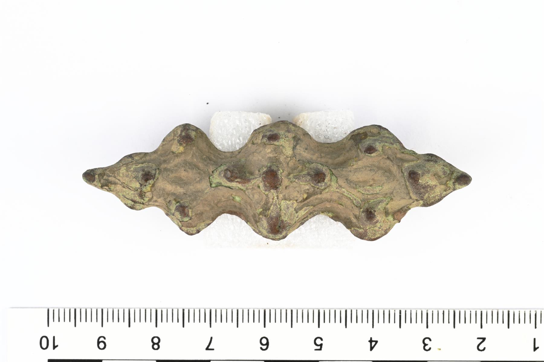 | Kokonaisena säilynyt tasavartinen solki. Neulasta on säilynyt pala. Koristeluna viivauurrekuviointia ja tappeja. Taustapuolella on neulakota sekä kaksi rinnakkaista neulan kiinnityslenkkiä. Vrt. Kivikoski Fig. 12. | |