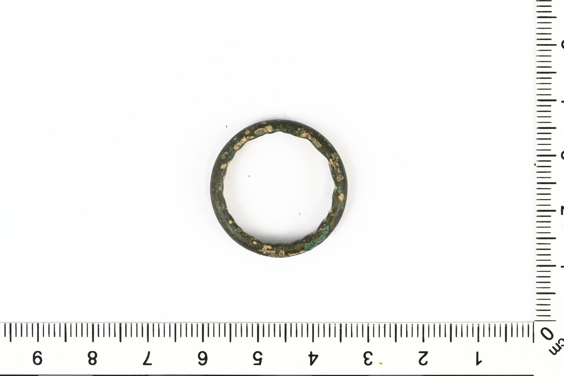 | Tasaleveä umpisormus. Sisäpinnassa on poikittaisia uurteita, jotka ovat mahdollisesti epätasaisen sormuspinnan jättämiä valmistusjälkiä. | |