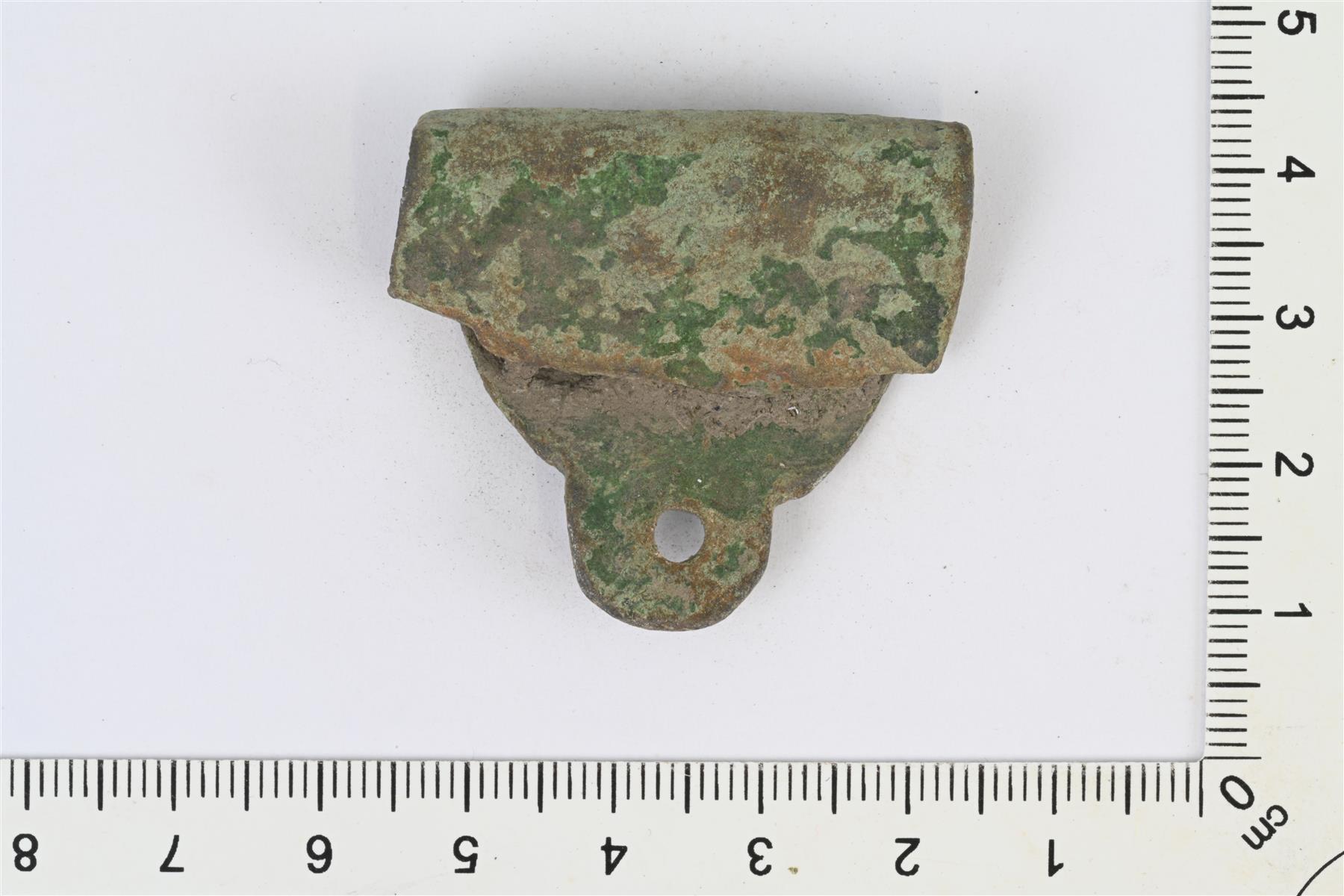 | Muotoiltu kupariseoslevy, joka taipunut kaksin kerroin. Toinen pää pyöristetty ja siinä lenkki. | |