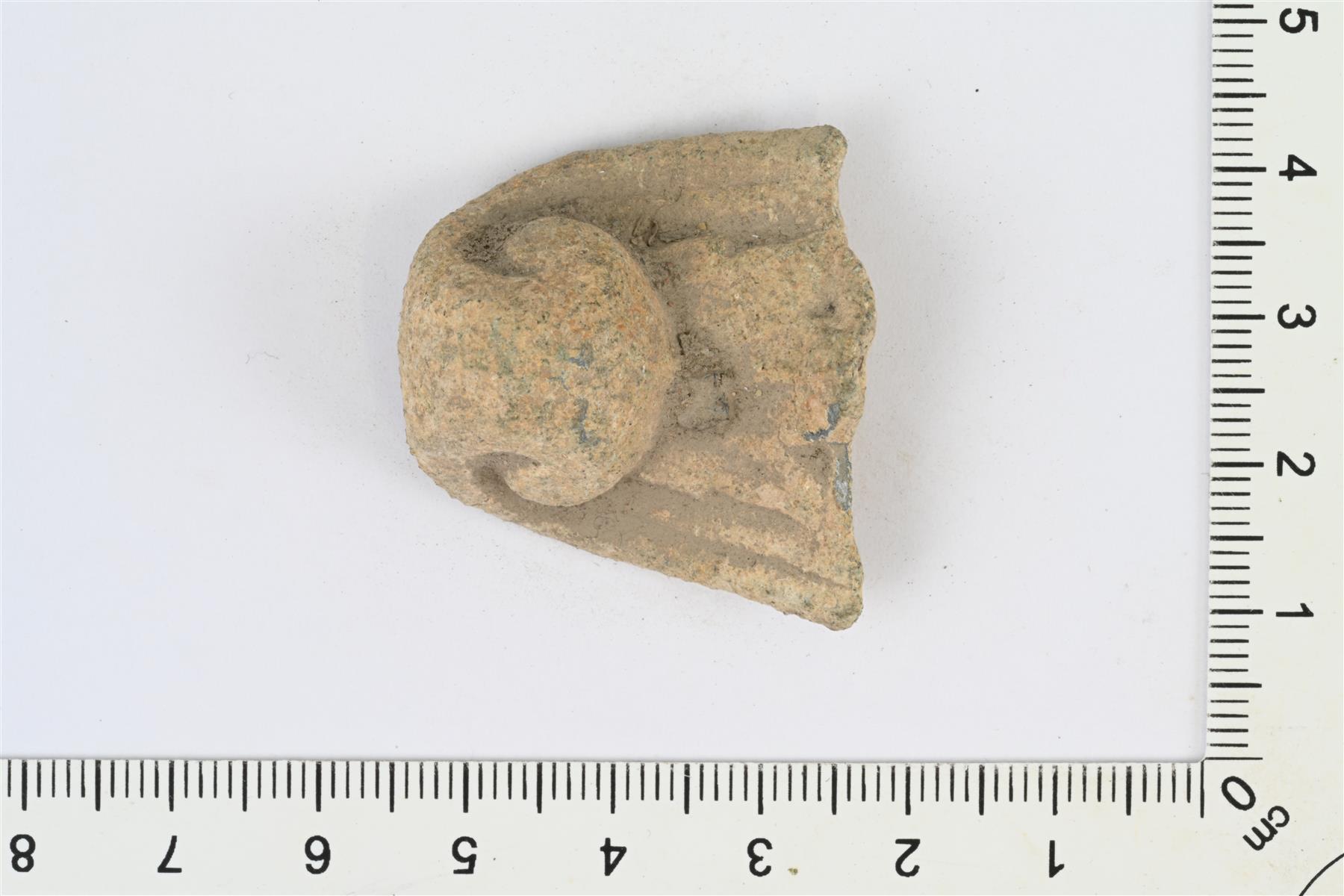 | Valetun koriste-esineen katkelma. Taustapuolella rautainen piikkimäinen kiinnitin. | |