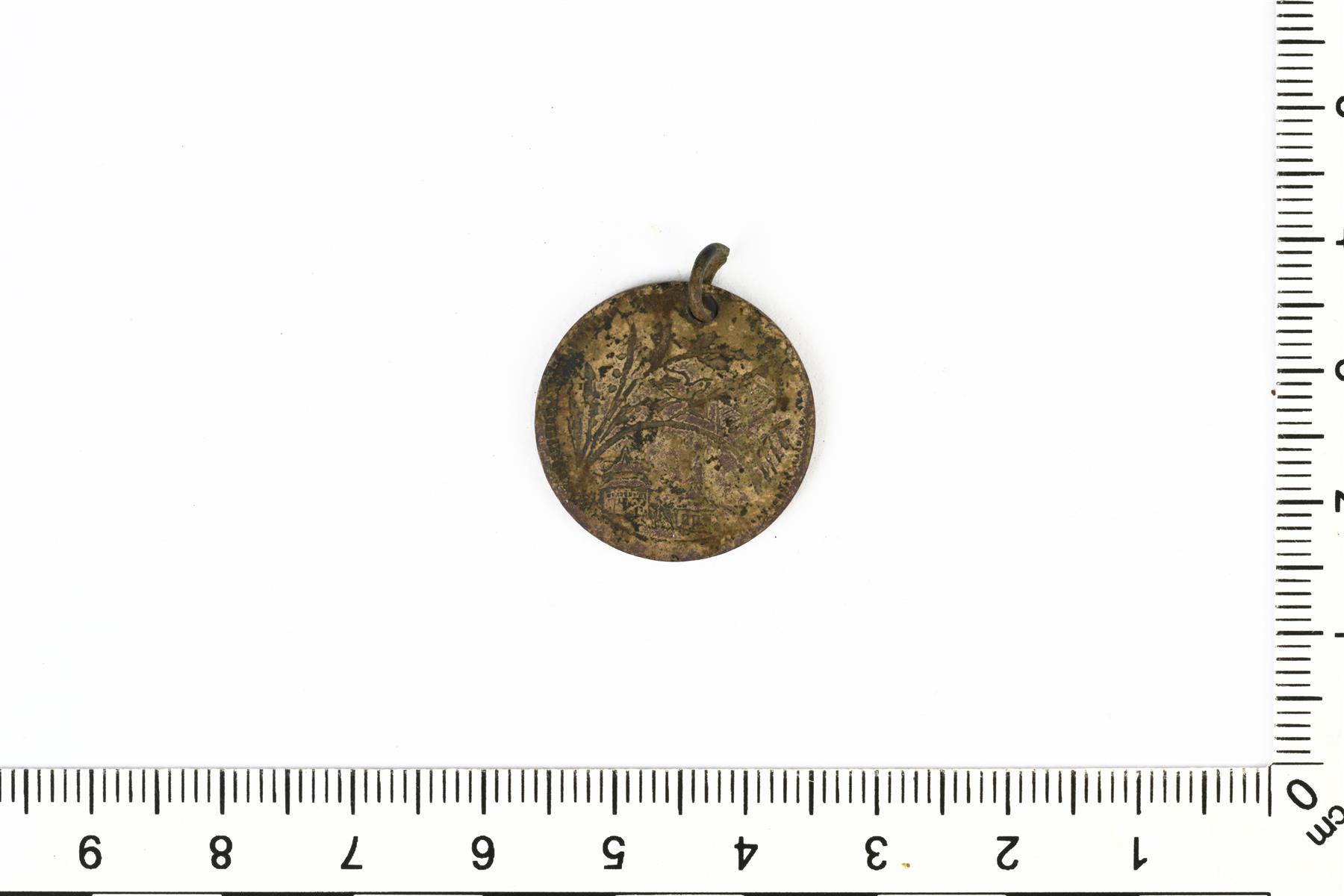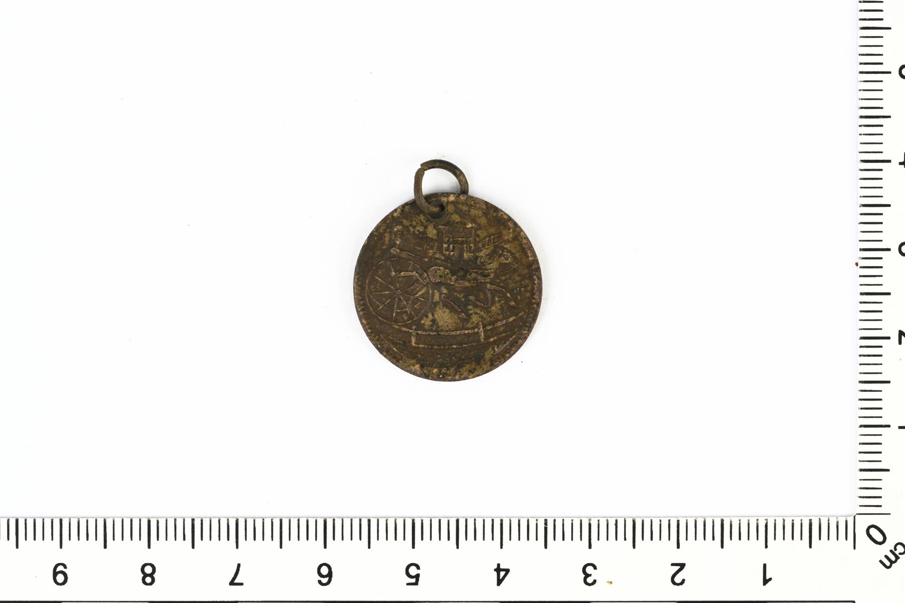 | Pyöreä riipus / mitali. Yhdellä puolella on koristeaiheena hevoskärryt ja rakennus. Vastapuolella on kasviornamentiikkaa. Reunassa on reikä ja ripustuslenkki. | |