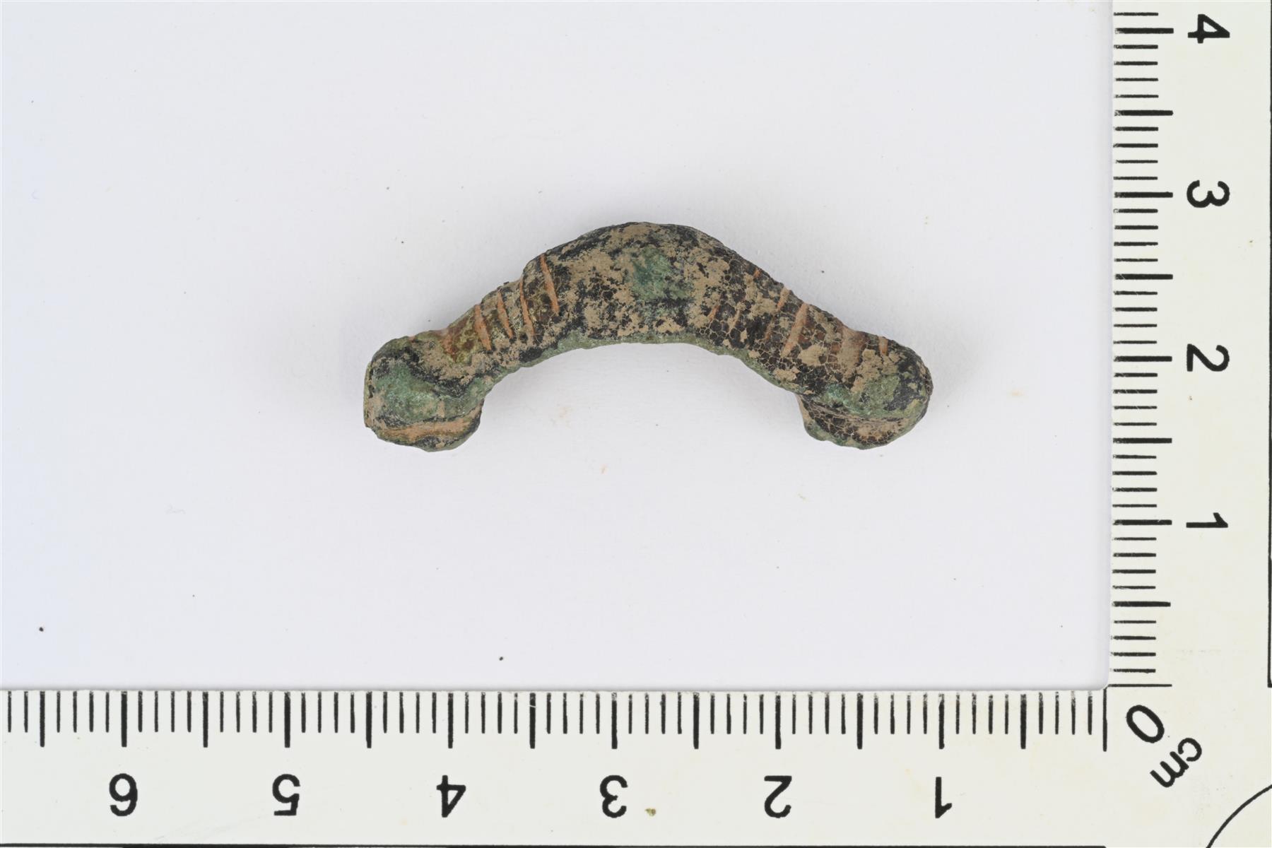 | Tasavartinen solki, josta puuttuu neula. Päissä koristeluna poikittaisia viivauurteita. Pinta osittain mustunut ja krakeloitunut, luultavasti ollut tulessa. | |