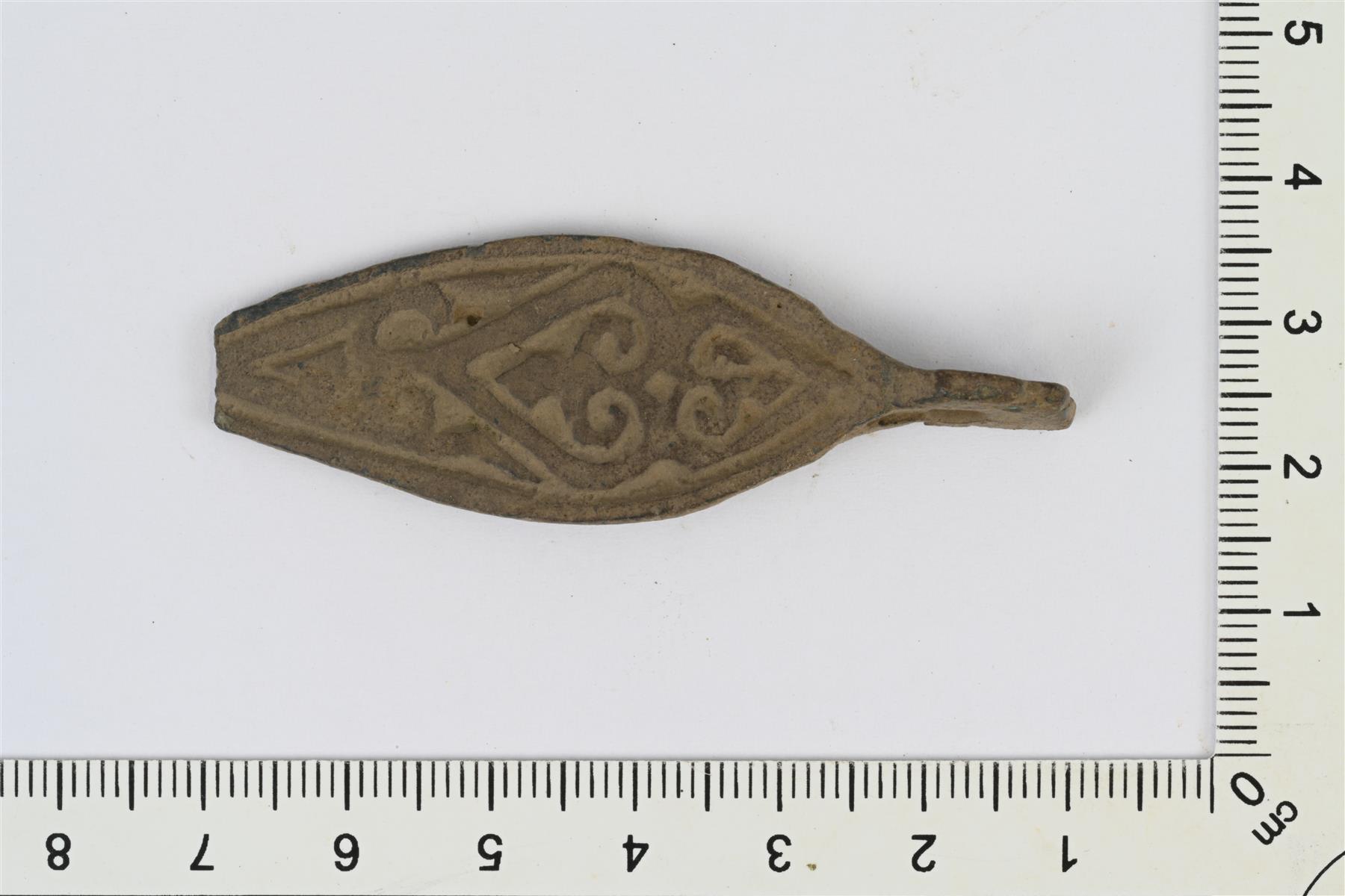 | Palmettikoristeisen korvalusikan katkelma. Koristellun osan toisessa päässä lenkki, toinen pää murtunut. | |