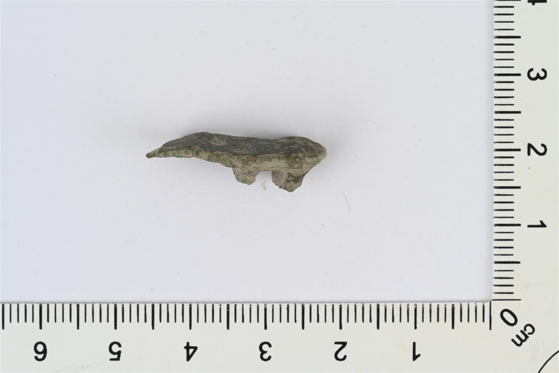 | Soljen katkelma. Etupuoli sileä, ei näkyvää koristelua. Taustapuolella neulanpidikkeen jäännettä. | |
