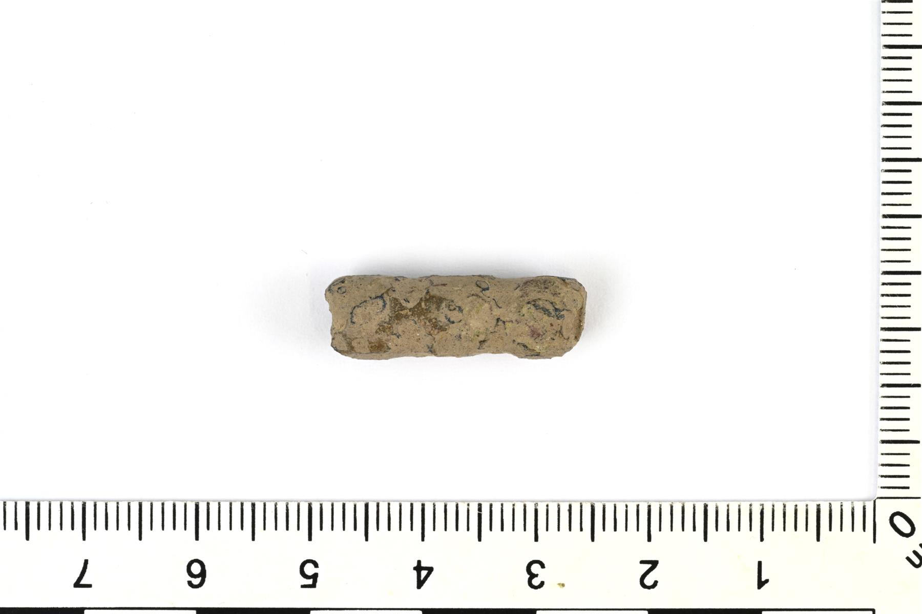 | Kolmelohkoinen ja fasetoitu sarjahelmi. Koristeluna häränsilmäleimoja. | |