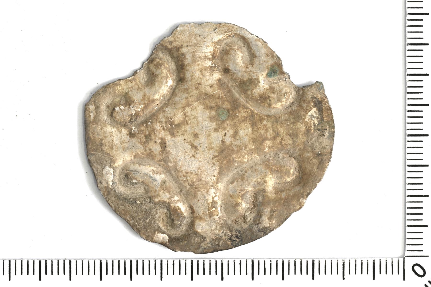 | Kiekkomainen, ohut hopealevyriipus. Reunoilta puuttuu paloja. Riipukseen on pakottu neljä symmetrisesti aseteltua C-kaarikuviota. Samantapainen, mutta ei identtinen kuin Kivikoski 1973: Abb. 1130 ja 1131.