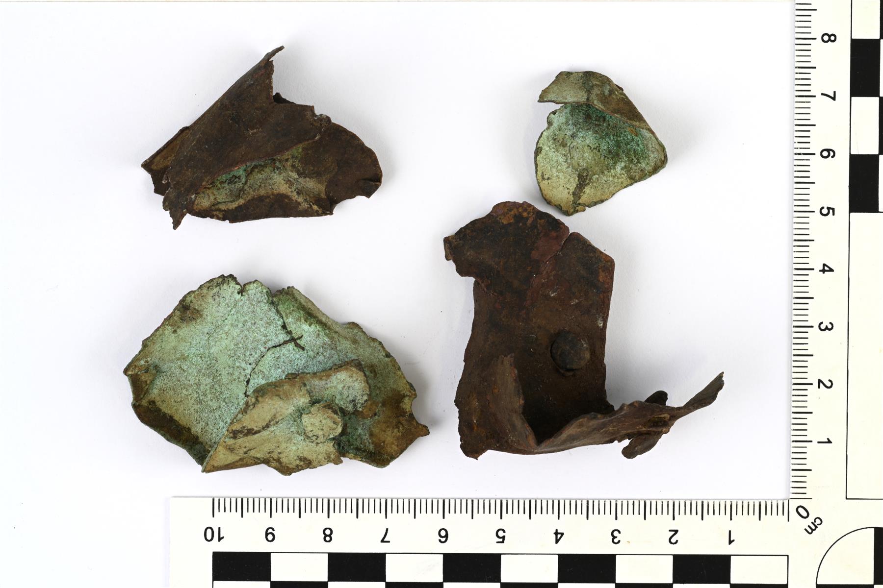 | Niitattuja kupariseospellin katkelmia. Todennäköisesti padan tai muun astian kyljestä. | |