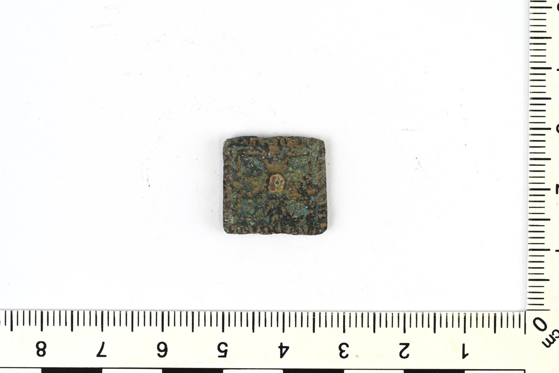 | Neliömäinen ruusukehela. Koristeluna vinoristi. Keskellä on reikä, jossa on kiinnitysniitin jäänne. | |