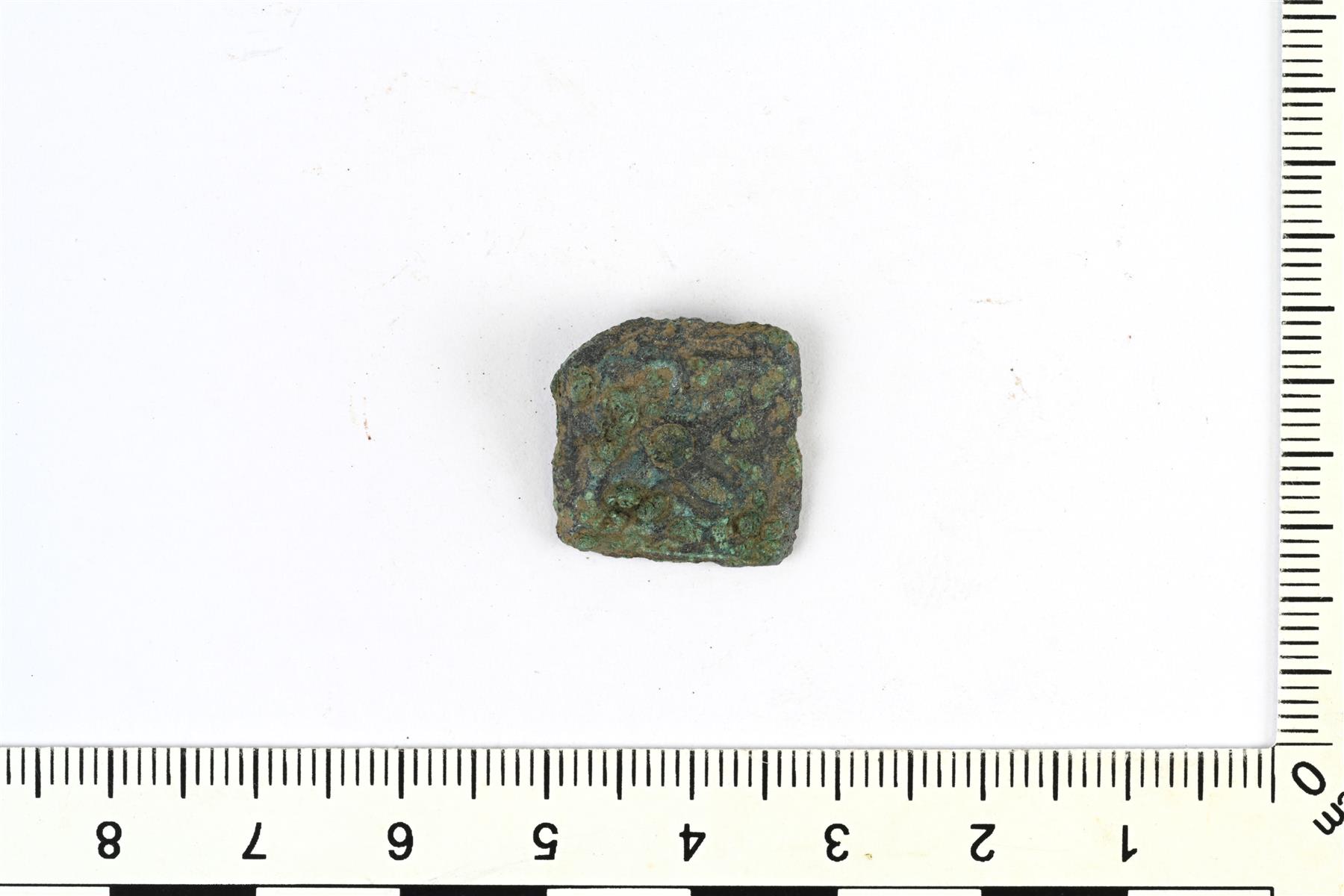 | Neliömäinen ruusukehela. Koristeluna vinoristi. Keskellä on reikä, jossa on kiinnitysniitin jäänne. Osittain sulanut. | |