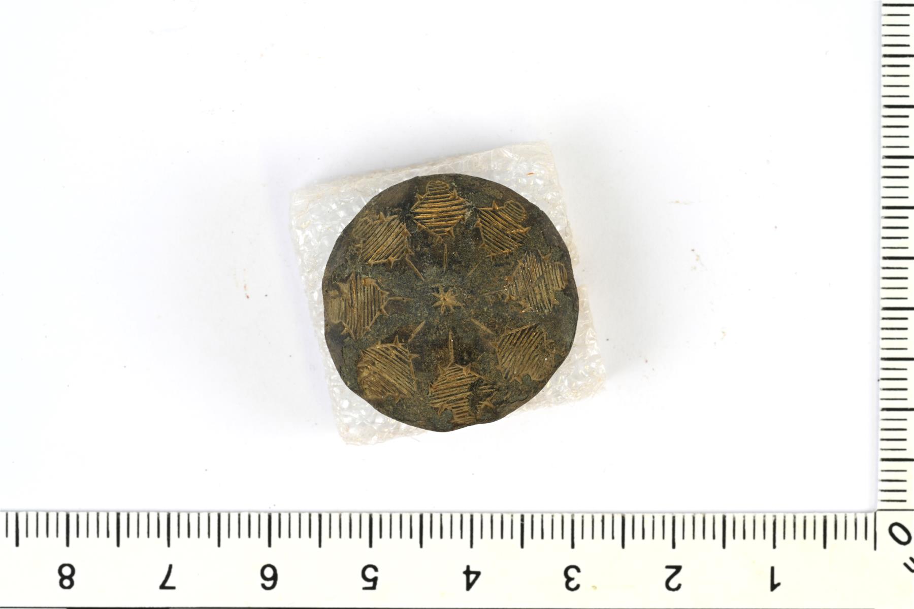 | Kuperapintainen nappi. Pinnassa on kultauksen jäänteitä. | |