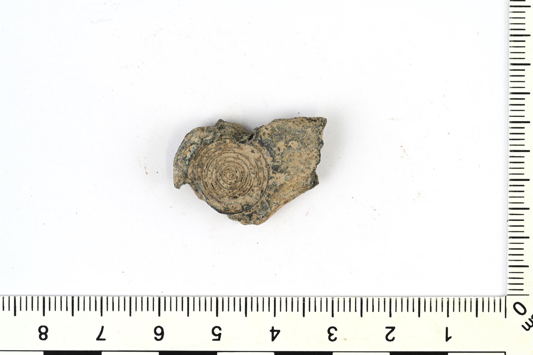 | Sisäkkäisillä kehillä koristellun tinaesineen katkelma. | |