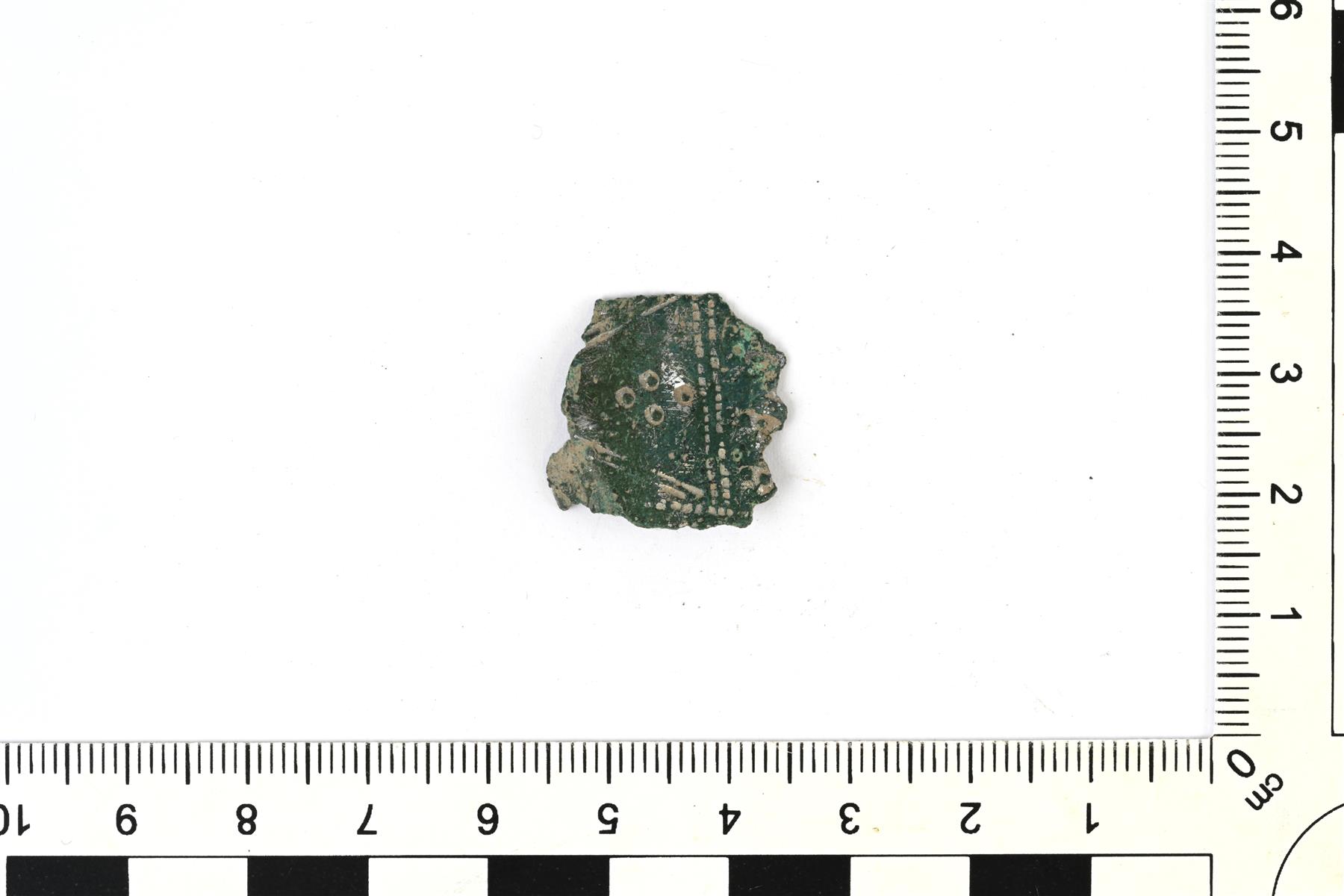 | Tupenhelan katkelma. Koristeluna viivauurteita ja häränsilmäleimoja. | |