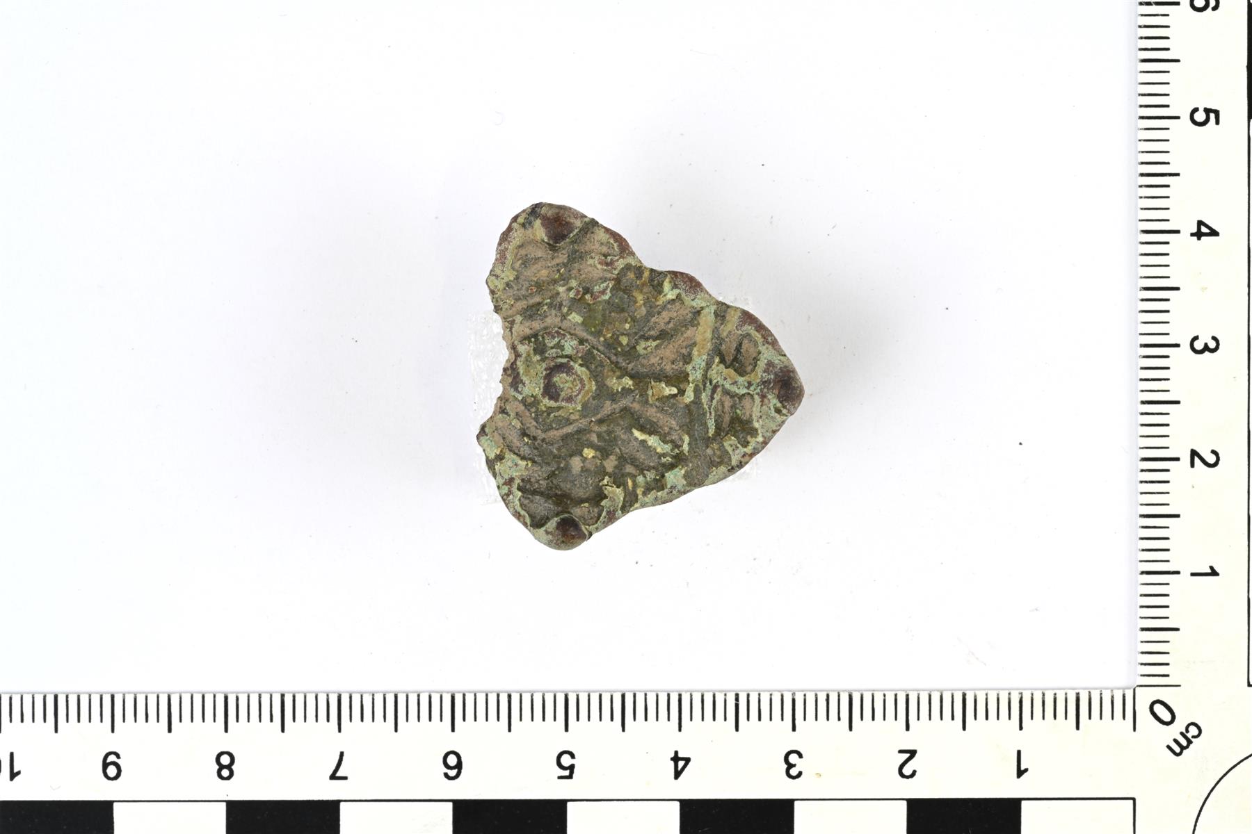 | Tasavartisen soljen päätykatkelma. Koristeluna tappeja ja viivauurrekuviointia. Taustapuolella on neulakota. | |