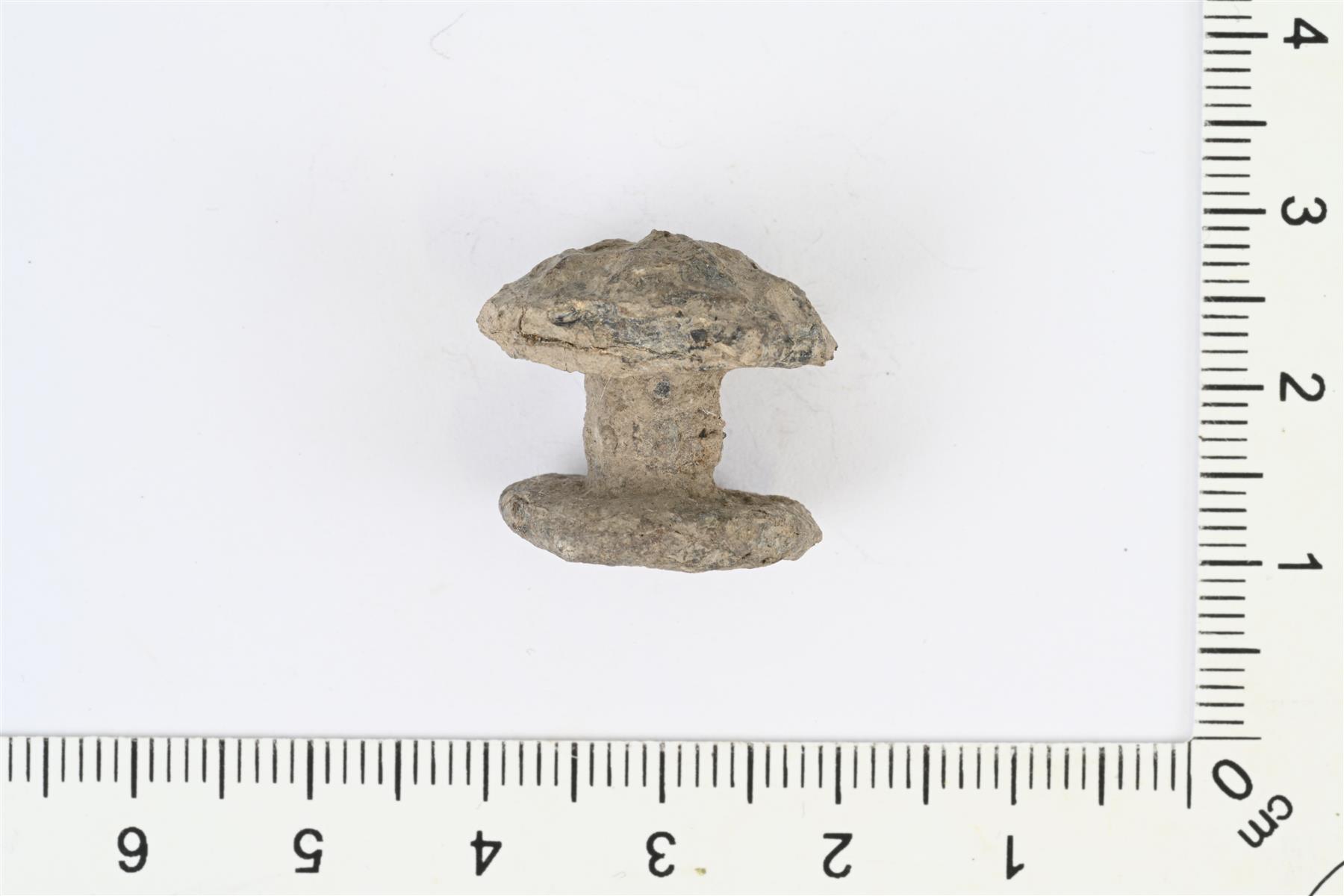 | Kaksoisnappi, jossa etupuolella puolipallonmuotoinen nappi, taustapuolella litteä nappi ja välissä lyhyt varsi. Etupuolella reliefikoristelua. | |