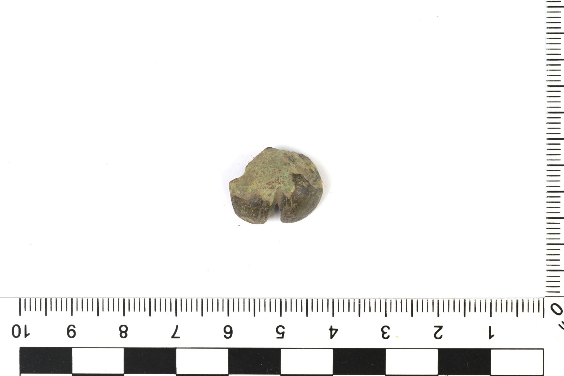 | Pallomaisen kulkusriipuksen katkelma. Alun perin neljälehdykkäinen. Lehdyköissä on viivakoristelua. | |