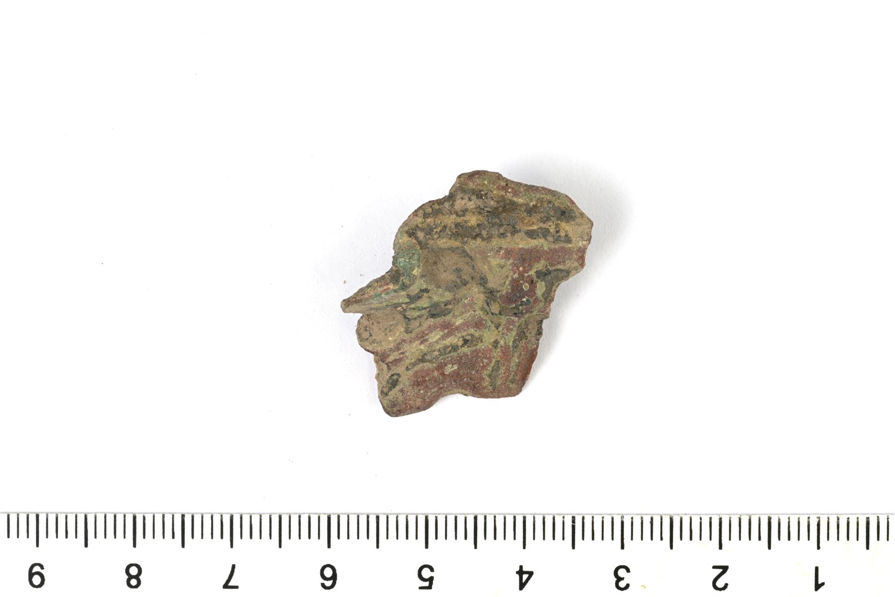 | Pyöreän kupurasoljen reunakatkelma. Melko kulunut. Taustapuolen neulan kiinnityslenkki on hajonnut. Vastaa lähinnä C/D- tai D-tyypin solkia. | |