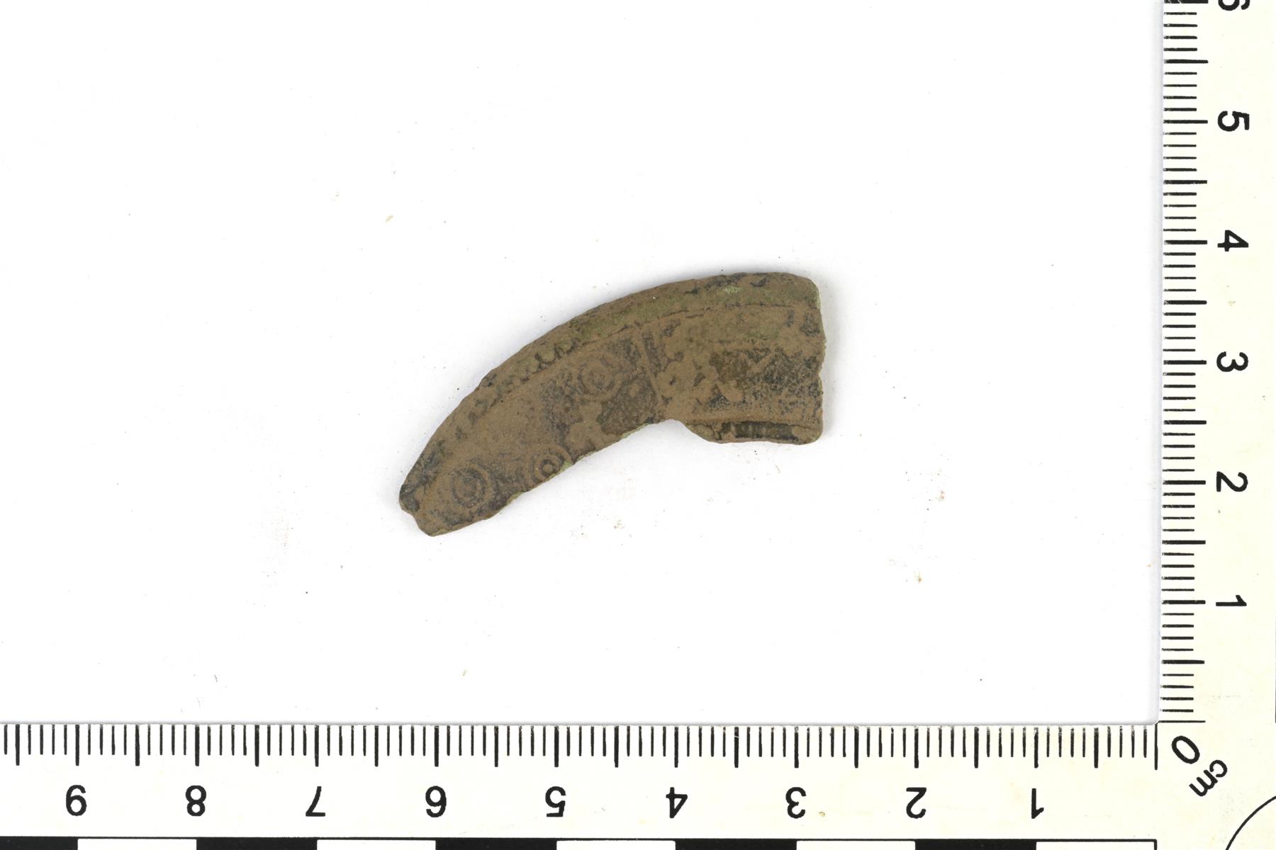 | Levymäisen riipuksen tai soljen katkelma. Koristeluna häränsilmäleimoja | |