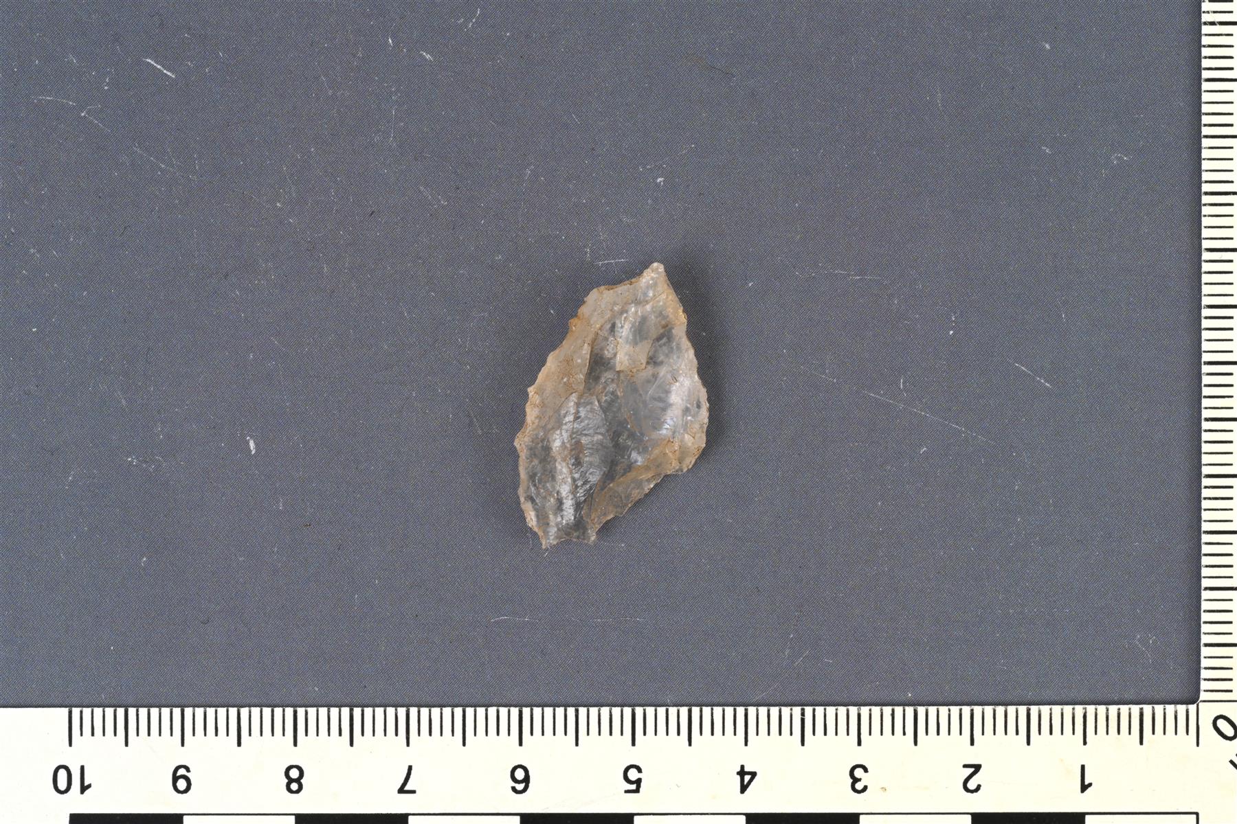 | Kvartsinuolenkärki tai iskos. Reunoilla näyttäisi olevan työstöjälkiä. | |