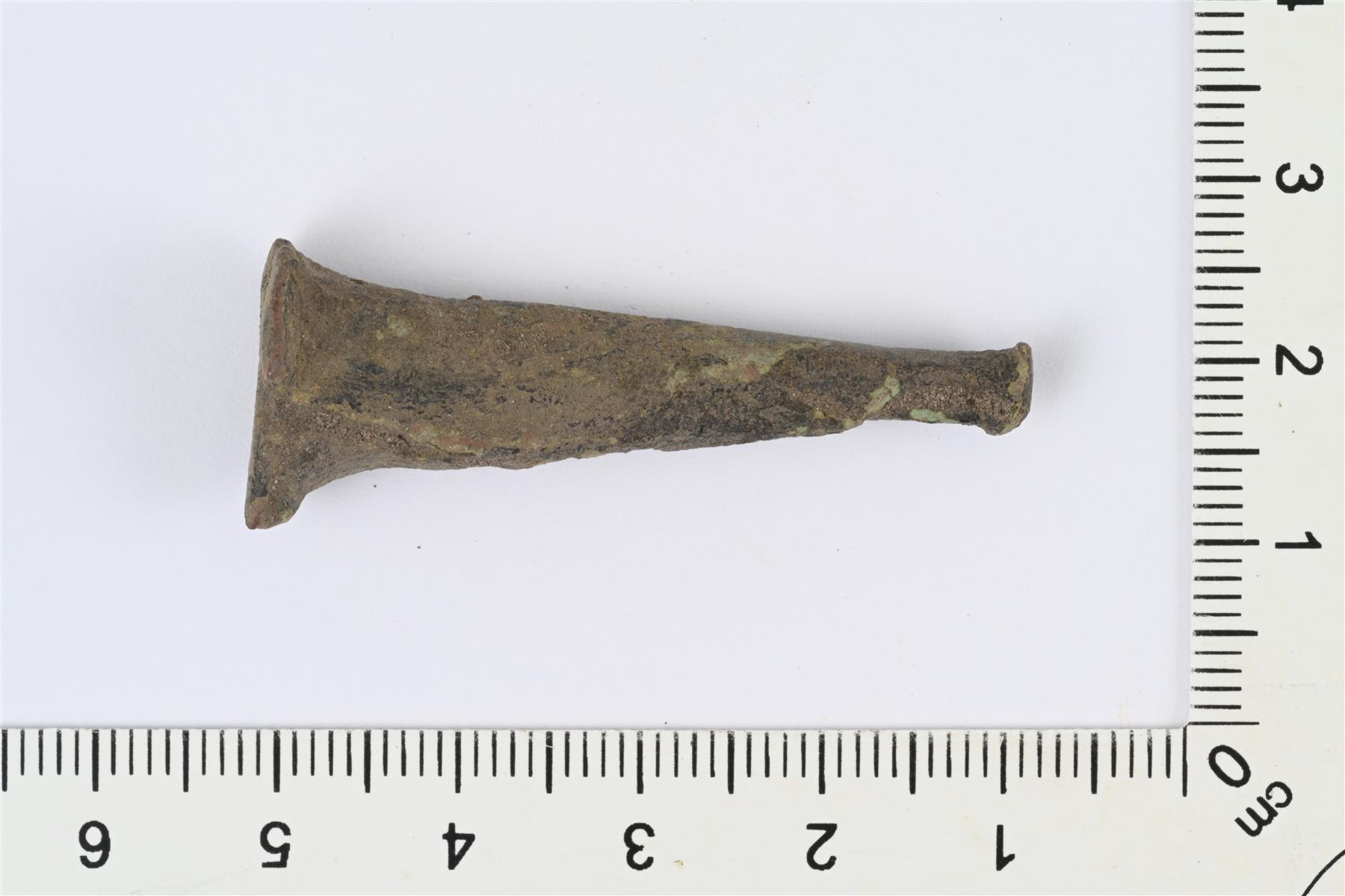 | Toiseen päähän kapeneva pitkänomainen kupariseospala. Mahdollisesti jalka tms. Voi olla myös sulanutta metallia. | |
