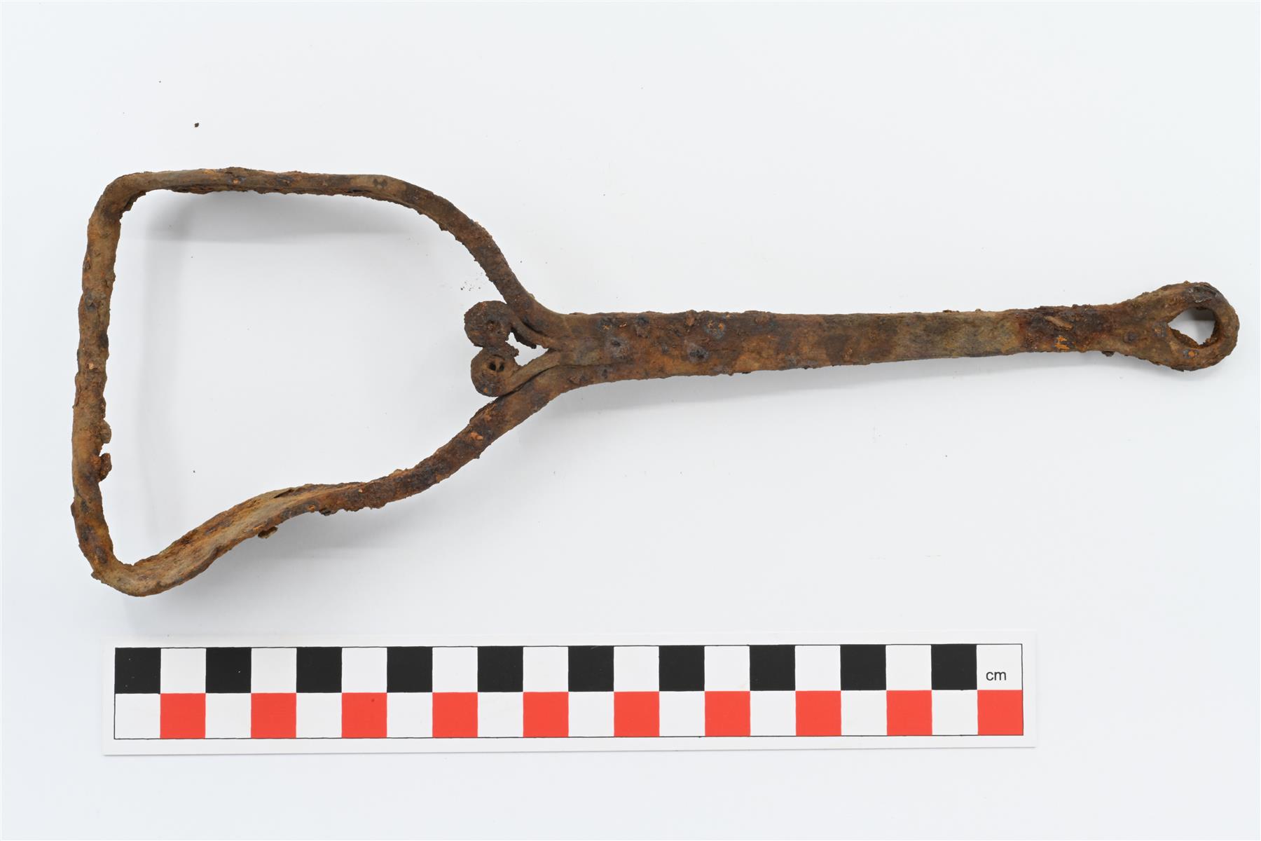 | Pitkänomainen rautaesine. Poikkileikkaukseltaan nelikulmainen varsi, jonka toisessa päässä suuri lenkki ja toisessa päässä pieni lenkki. Suuressa lenkissä hieman kaarevat sivut ja suora pääty. Sivut leveät ja levymäiset, pääty kierteinen tanko. Varren ja suuren lenkin liitoskohdassa spiraaleiksi taivutetut koristeet. Mahdollinen jalustin, joskin lenkki on kooltaan jalustimeksi hyvin pieni. | |
