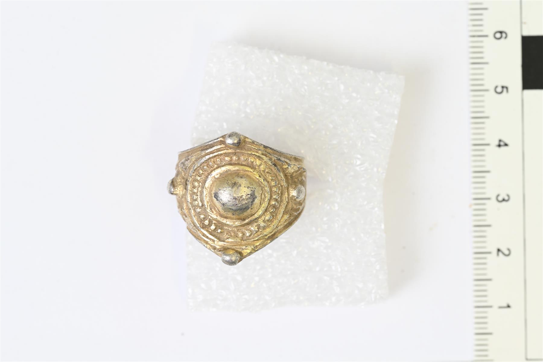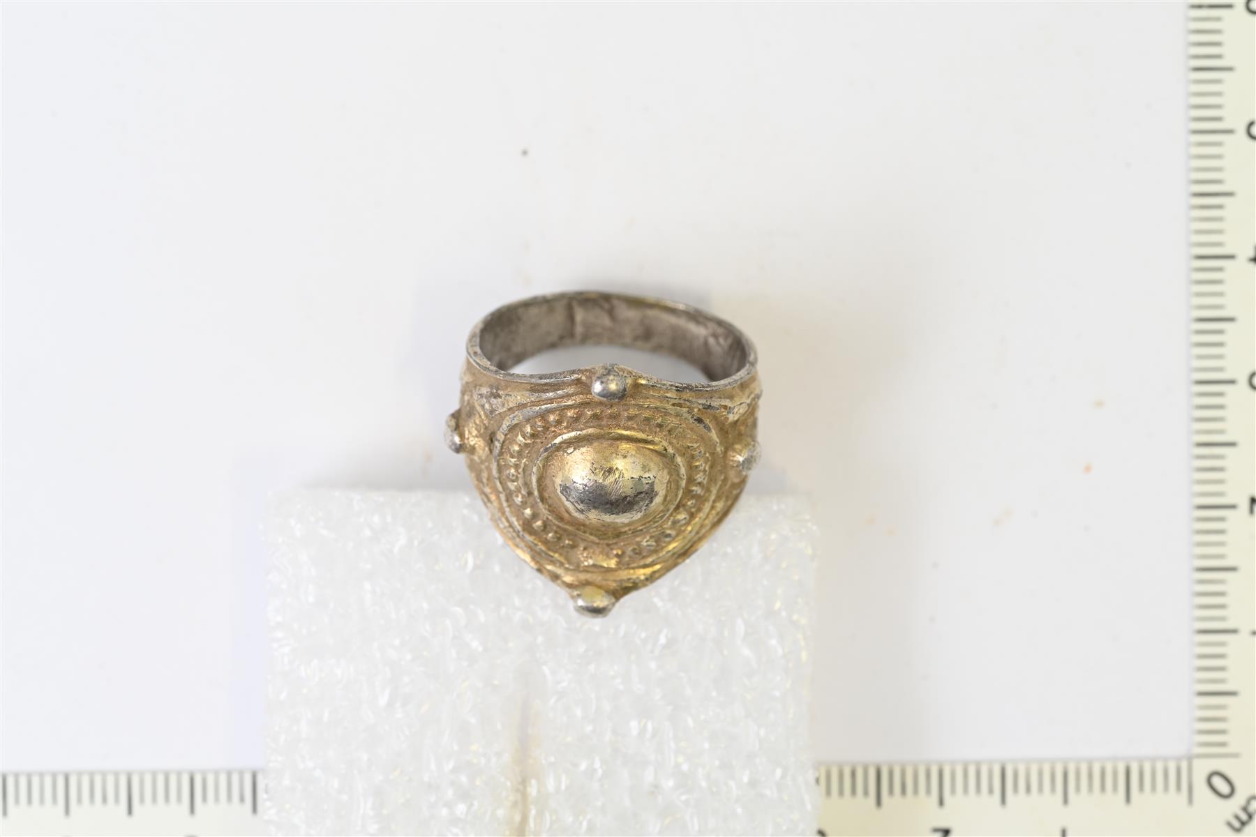 | Ikonografinen sormus, täysin ehjä. Hopeaa, kultausta jäljellä. Rombinmuotoinen kanta, jossa neljä tappia kulmissa ja keskellä pakotettu pyöreä kohokuvio, jota ympäröivät helmiviivakehä ja viivakehä.