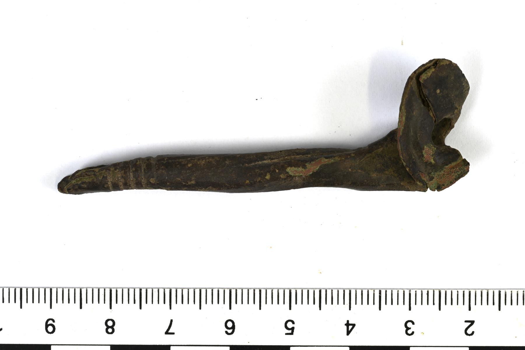| Kupariseosvarras. Yhdessä päässä on reiällinen levy. Toinen pää on lovettu. | |