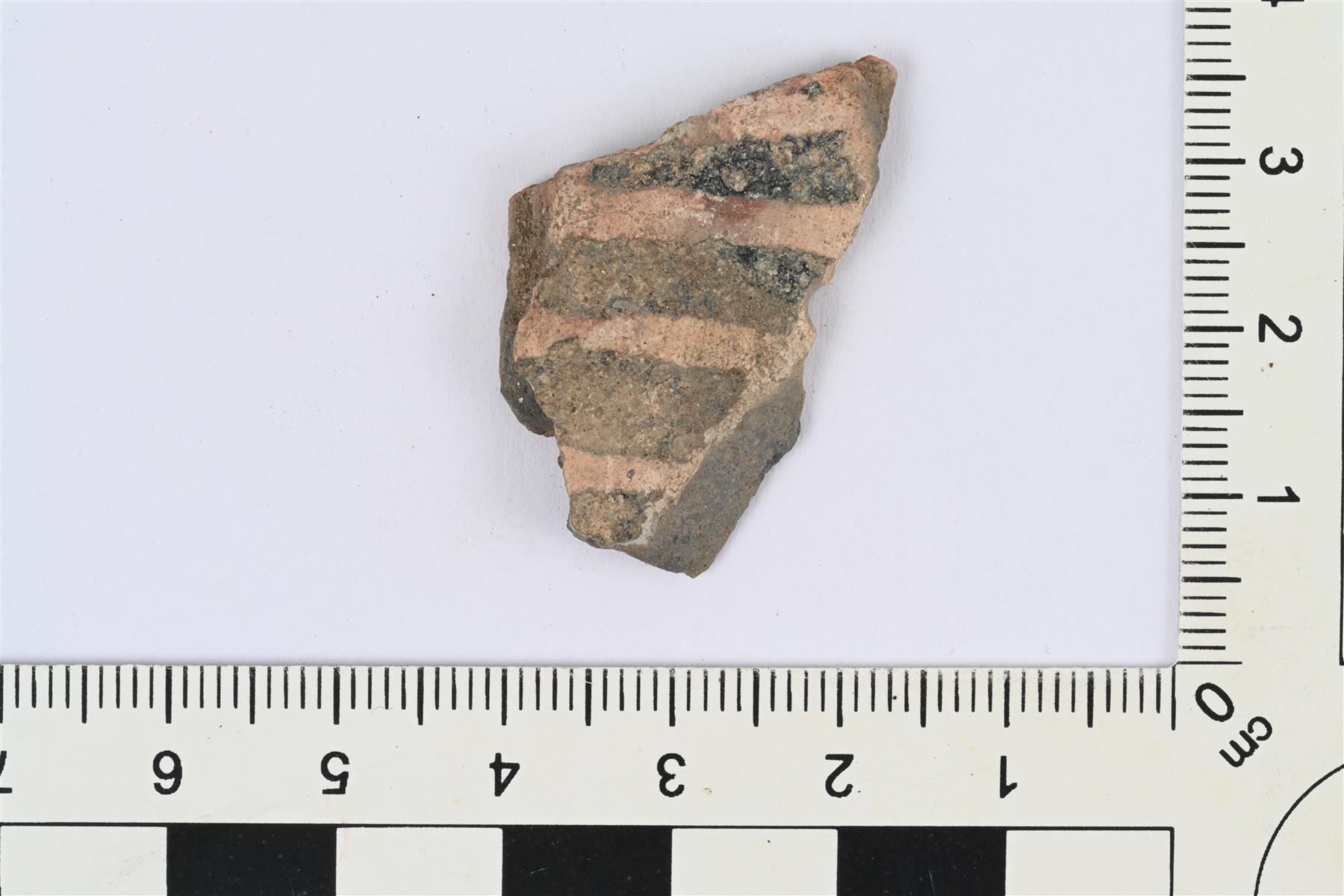 | Punasaviastian kylkipala. Sisäpinnalla boluskoristelua, jossa valkosaviraitoja, ja rippeitä lyijylasitteesta. | |