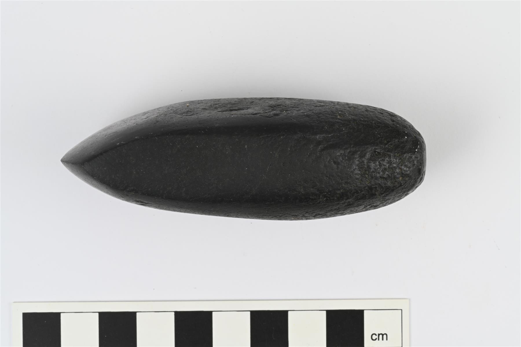 | Oikokirves. Mustaa kivilajia, mahdollisesti diabaasia. Hiottu lähes kauttaaltaan huolellisesti, kanta hieman karkeampi. Kapenee hieman kantaan. | |