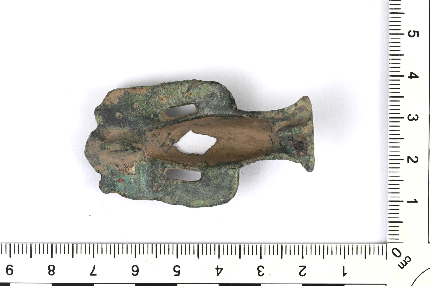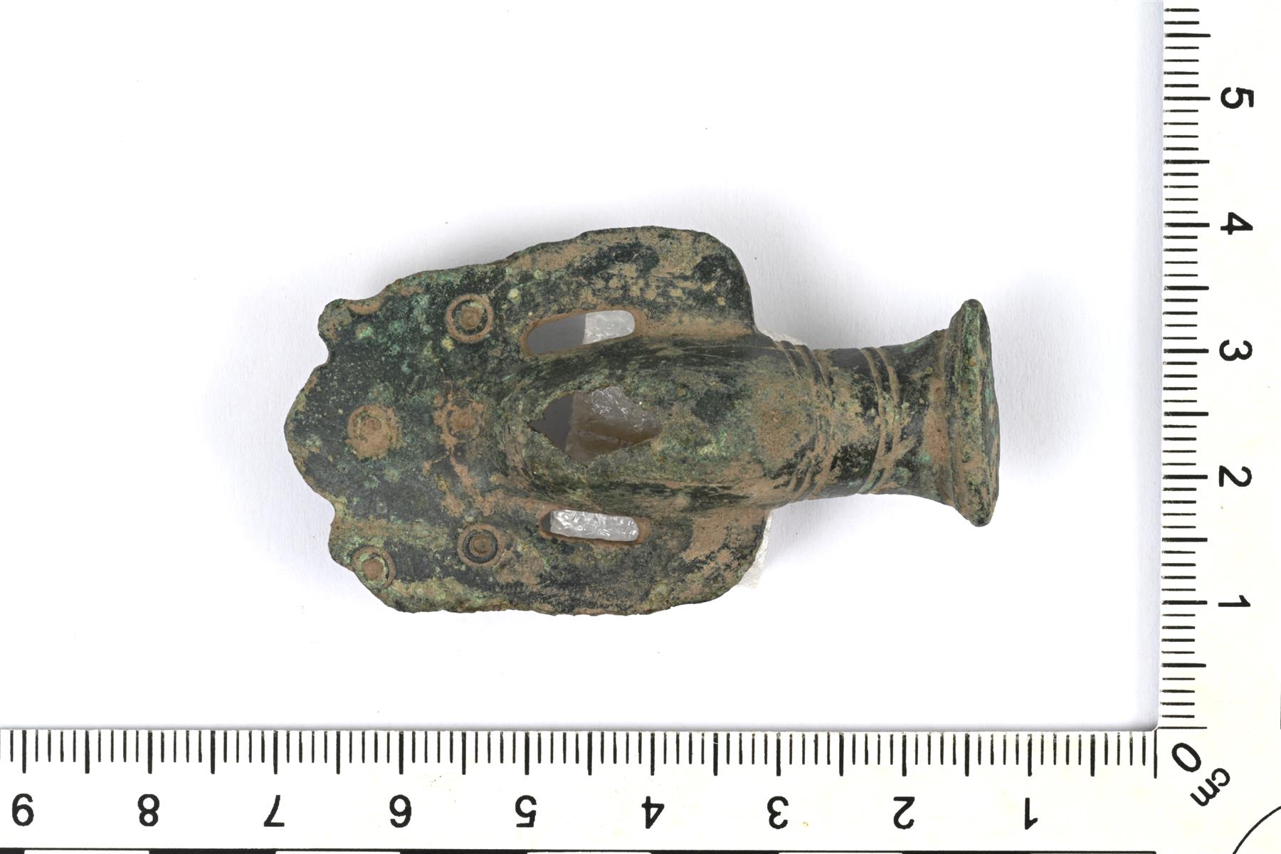 | Kaaresta osittain hajonnut rapusolki. Etupään levy on lattea ja koristeltu häränsilmäleimoilla. Jalassa on koristeluna viivauurteita. Neulakota ja neulan kiinnityslenkki ovat hajonneet. Muodon perusteella myöhäisempi variantti. Vrt. Kivikoski Abb. 397. | |