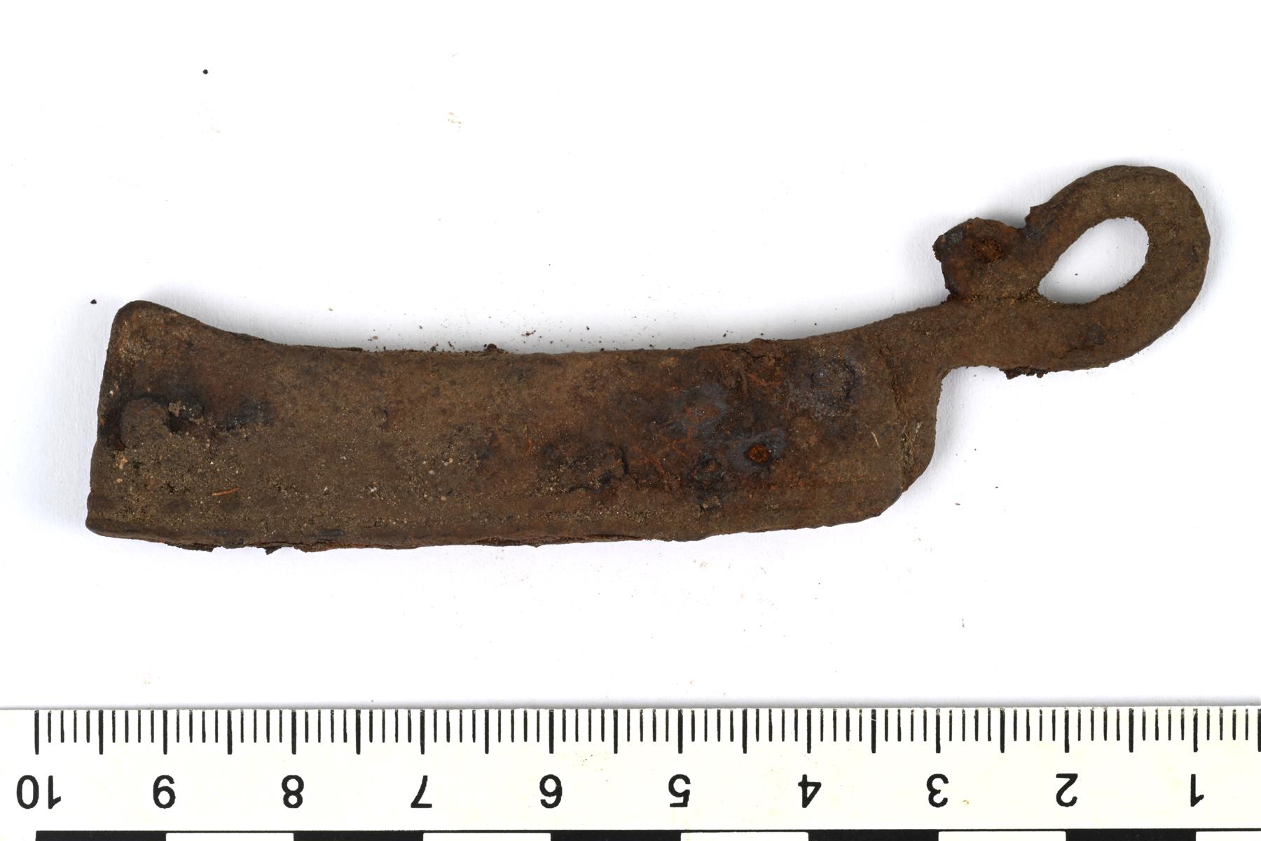 | Partaveitsi rautaisessa kotelossa. Toisessa päädyssä on taivutettu rautalenkki. Alaosassa on reunan suuntaisia viivauurteita. | |