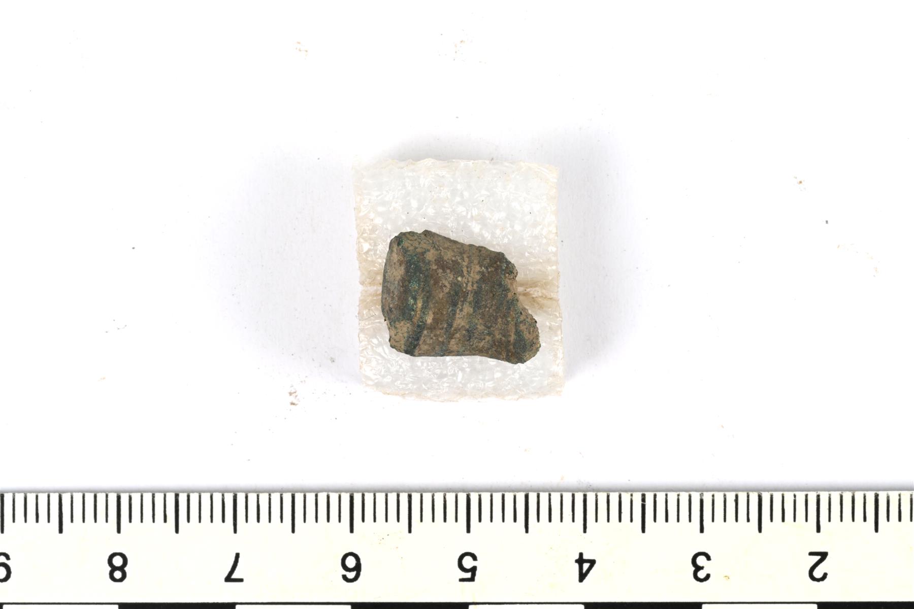 | Tasavartisen soljen päätykatkelma. Koristeluna viivauurteita. Taustapuolen neulakota on hajonnut. | |